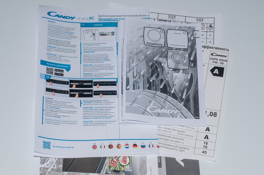 Остальные сведения, такие как технические данные, описание программ, панели управления и специальных функций, написаны сразу для нескольких моделей посудомоек без указания моделей, поэтому при чтении может возникнуть ряд вопросов. Для решения их или каких-либо уточнений по устройству можно обратиться в службу поддержки или прочитать информацию на официальном сайте Candy, что мы и делали несколько раз.