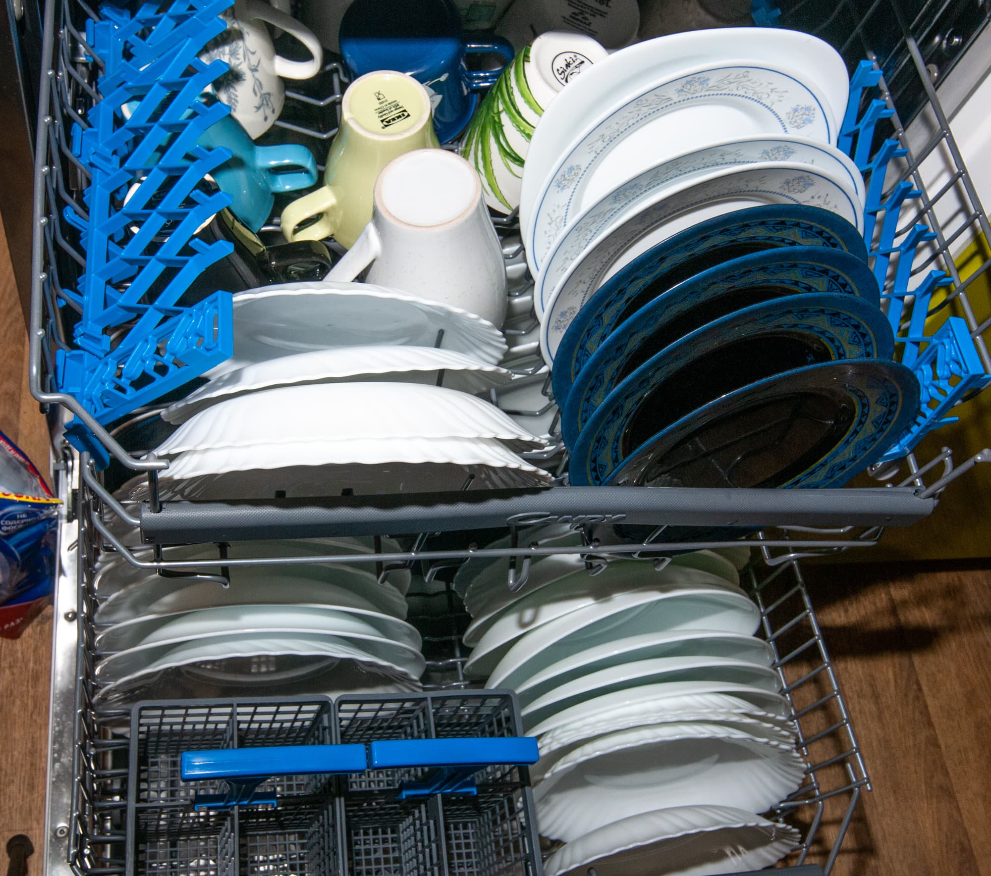 В верхнюю положили тарелки, банки, чашки, джезву из-под только что сваренного кофе, вилки и ложки. Поставили программу Р4 (универсальная мойка) с таблеткой референсного средства для посуды.