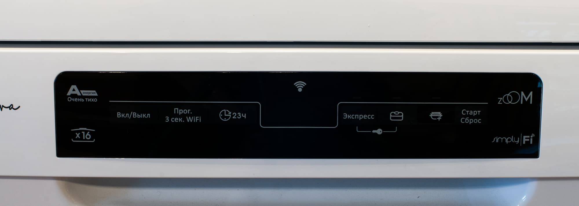 Меню можно вывести на большинстве европейских языков, в том числе и на русском. Для того чтобы запустить программу мойки, нужно включить машину клавишей «вкл.», выбрать программу с помощью кнопки выбора «прог. 3 сек. Wi-Fi» и нажать кнопку «старт/сброс».