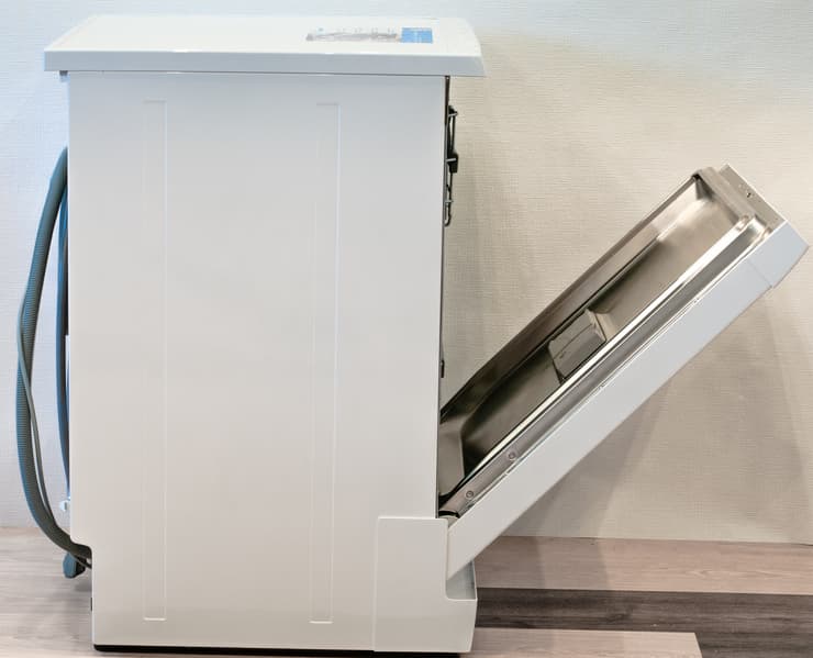 Сбоку устройства нет никаких дополнительных деталей, общая глубина машинки с полностью открытой дверцей 120 см.