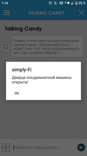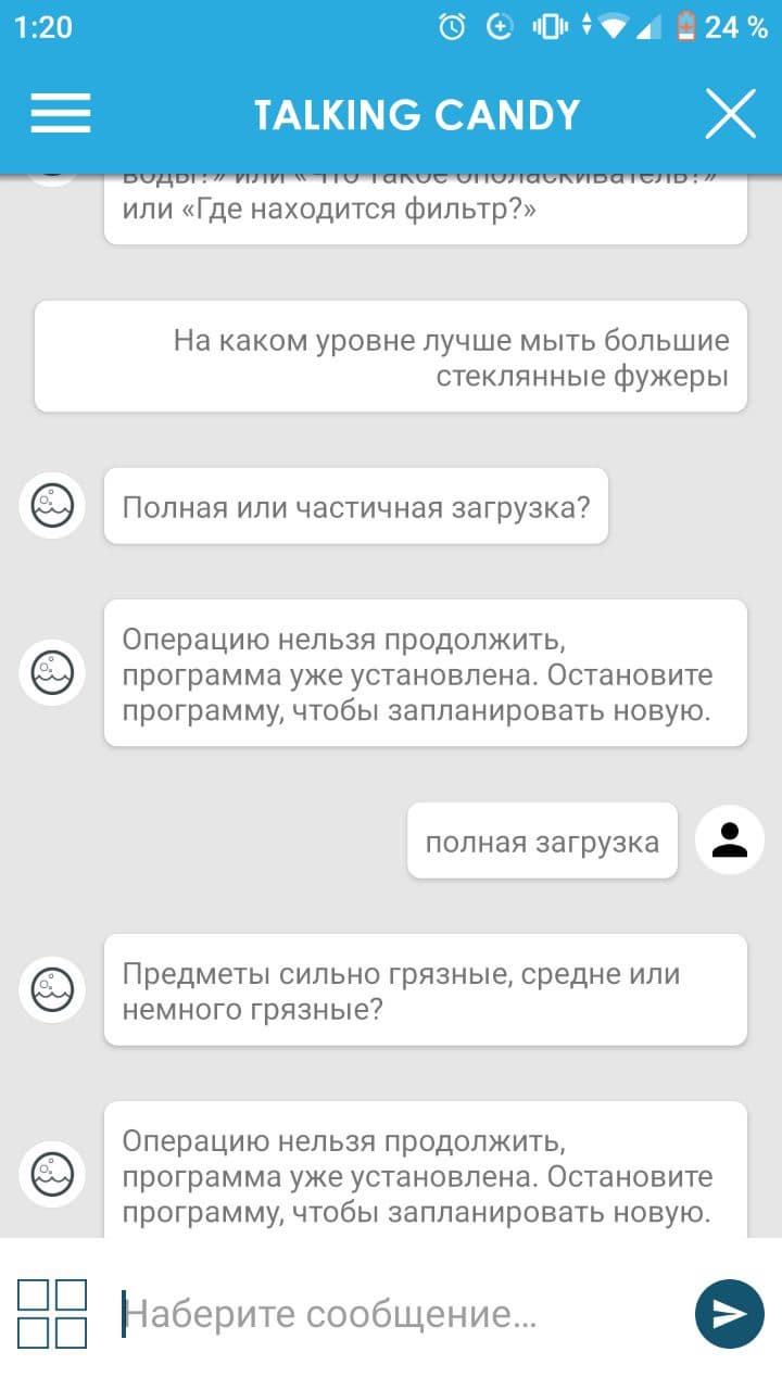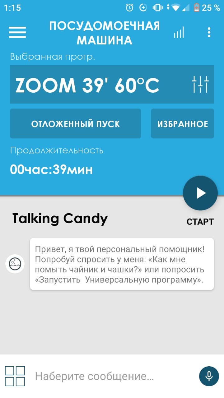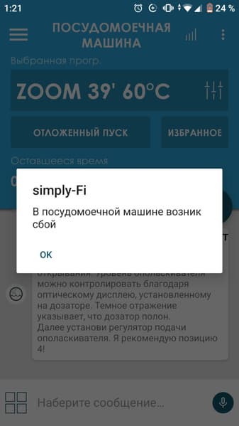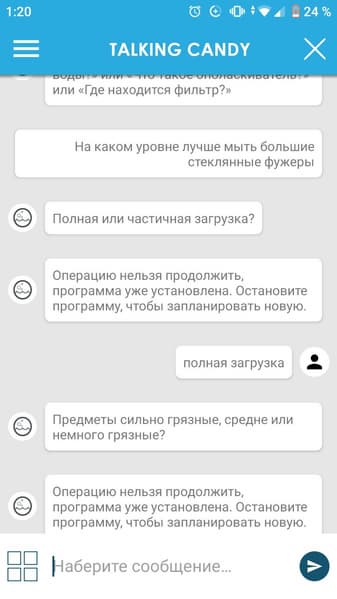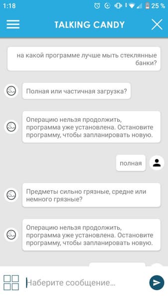 В приложении есть возможность легкого выбора программ, а также чата с роботом Candy, который быстро отвечает на вопросы. Если в работе прибора случились какие-то нештатные ситуации, на смартфон приходит уведомление — например, об открытой дверце или об ошибке. Для того чтобы перевести машину обратно в ручное управление, можно нажать и удерживать 3 секунды кнопки выбора программ или включения.