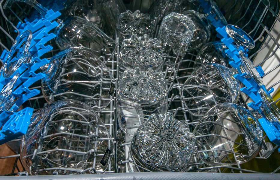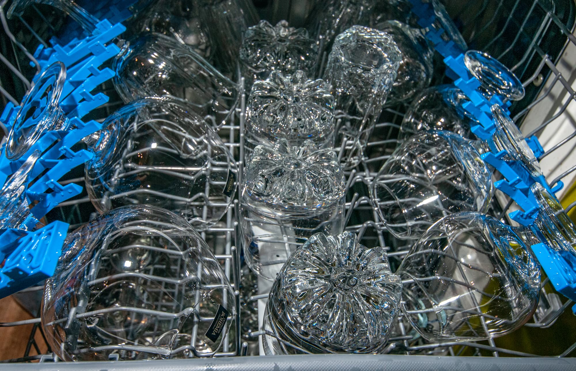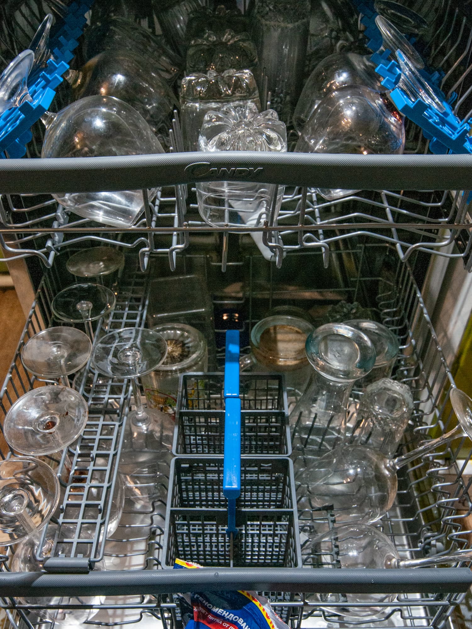 Мы загрузили в посудомойку стеклянные фужеры для красного вина, коньячные бокалы, пивные кружки, стаканы. Невысокие фужеры очень удобно вщелкнулись в держатели на верхней корзине, а вот высокие туда не влезли, пришлось придумывать для них конструкцию в нижней корзине из подручных материалов. Пивные кружки прекрасно встали снизу, бокалы-тумблеры — сверху. Запустили цикл универсальной мойки, положив таблетку референсного средства и нажав на клавишу «tabs».