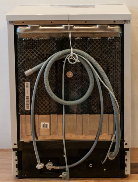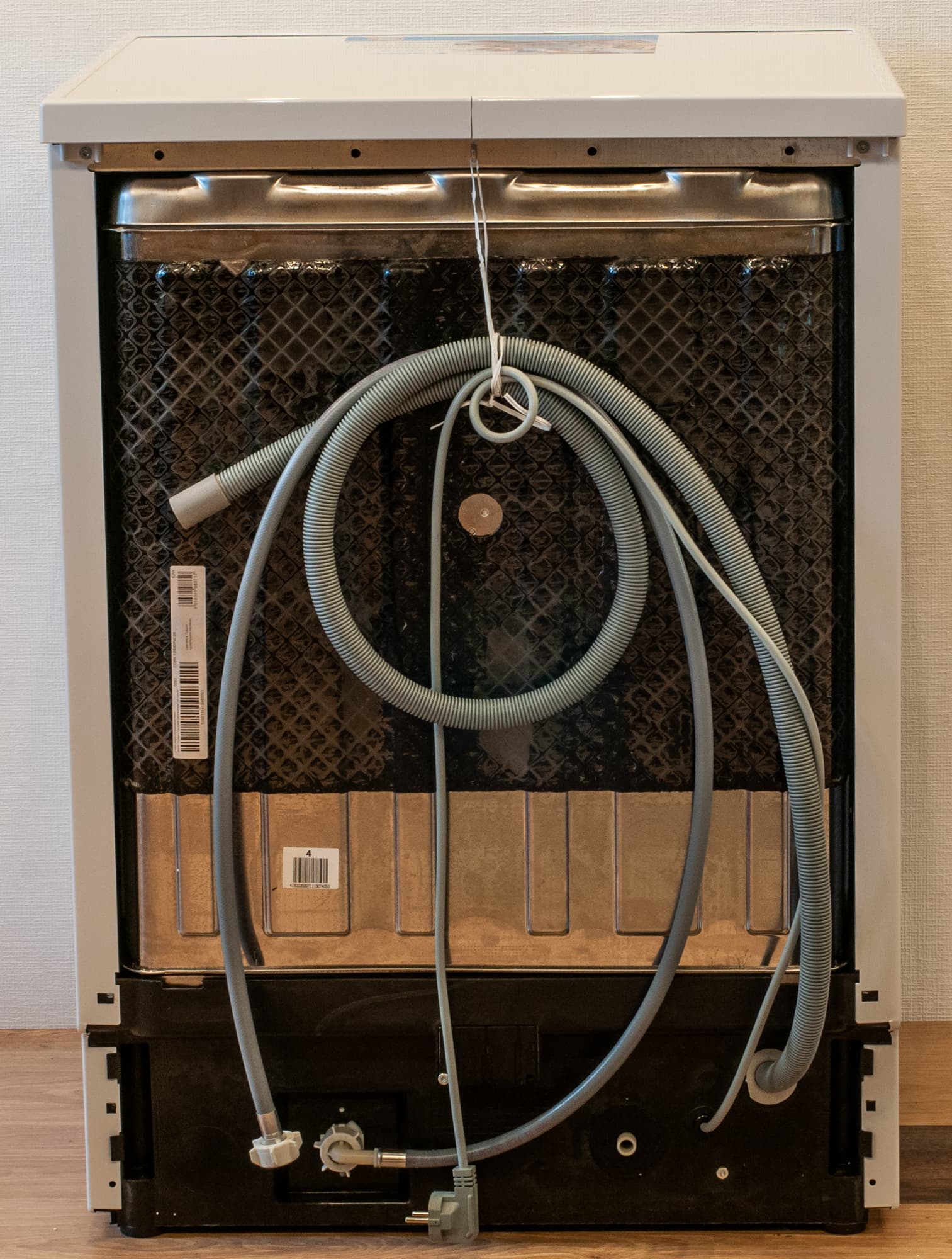 Шланги подачи воды и слива, а также шнур питания крепятся к машинке с задней стороны. Там же мы видим слой звукоизоляции и шильдики со штрих-кодом и краткими техническими данными модели. Производитель обещает крепить на машину QR-код для простого подключения устройства к сети Wi-Fi и авторизации в специальной программе. На нашем экземпляре такого кода не было, но это не сильно усложнило задачу по подключению. Вместо QR-кода можно использовать серийный номер, расположенный на шильдике сбоку дверцы.