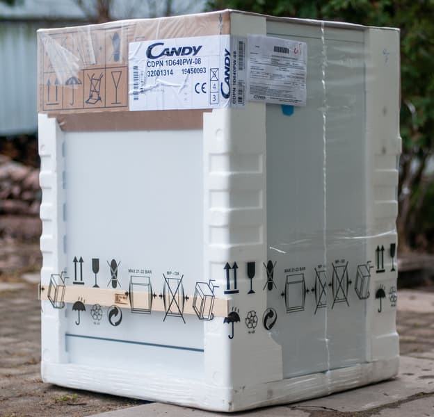 Посудомоечную машину доставила логистическая компания в защитной пенопластовой упаковке, укрепленной небольшими досками. Упаковка сверху была надежно затянута в толстую полиэтиленовую пленку, поверх которой нанесены служебные символы для транспортировки и хранения. Упаковка надежно защищает устройство от неприятностей при погрузке и перевозке.
