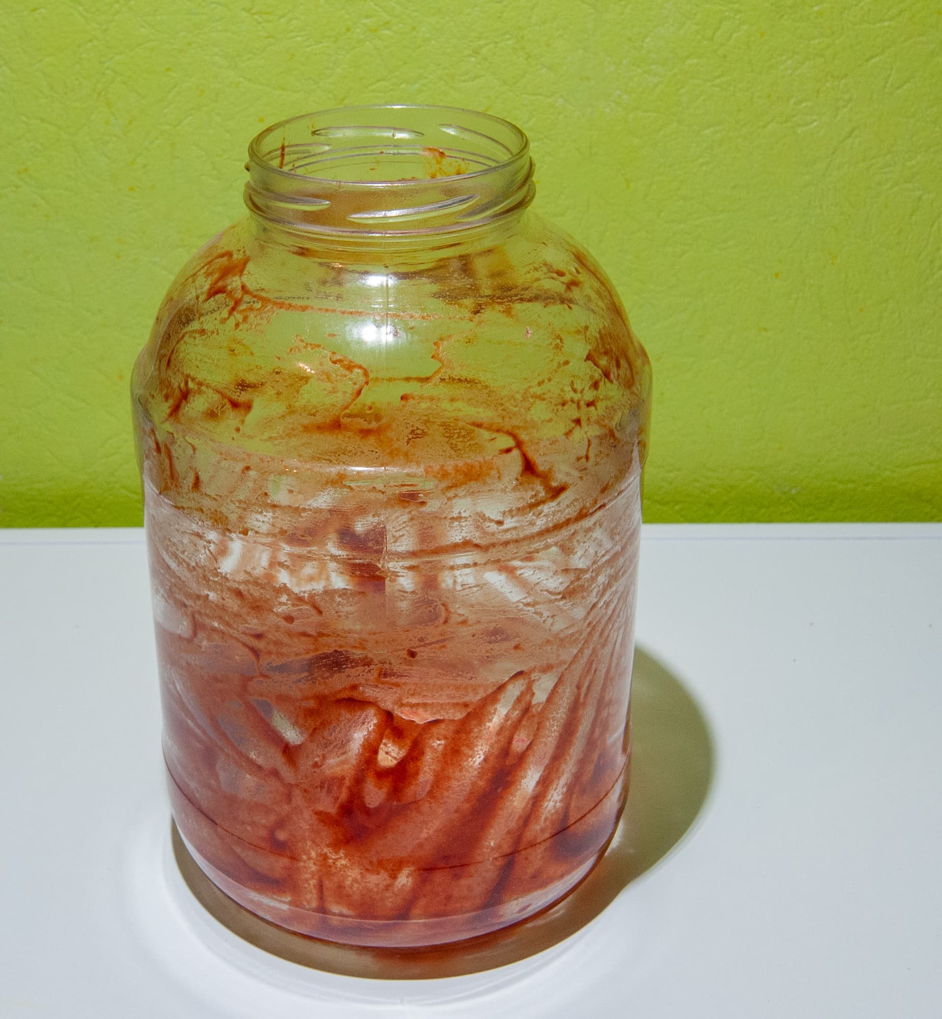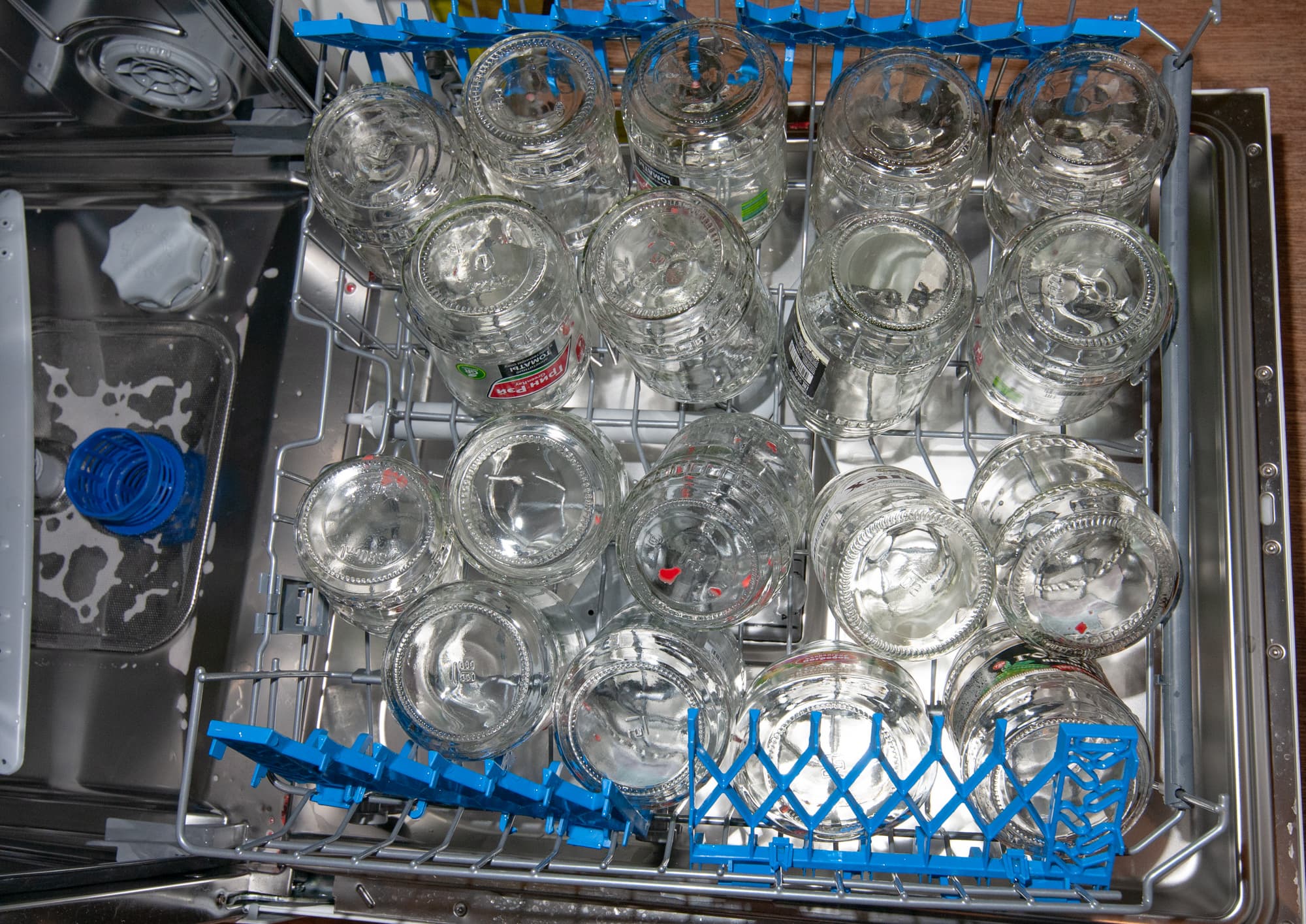Мы взяли трехлитровую банку, густо намазали ее кетчупом и сушили до полного высыхания кетчупа. Загрузили банку на нижний ярус посудомойки, заблокировав от падения. Больше в машинку ничего не ставили. Запустили программу Р5 (ежедневная мойка).