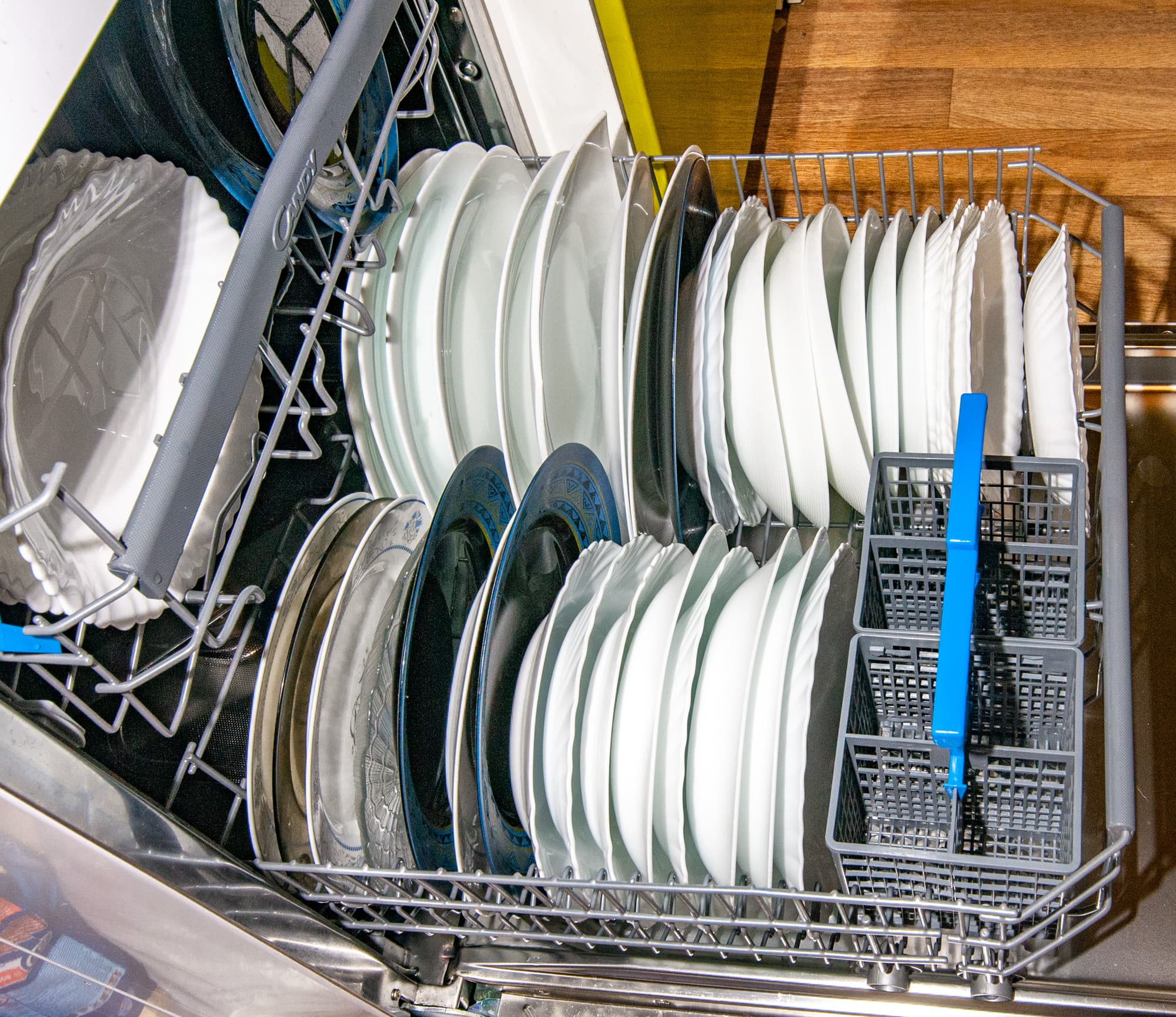Нам удалось загрузить в посудомойку 16 комплектов, состоящих из тарелки диаметром 28 см, большой суповой тарелки и мелкой тарелки, а на верхнюю полку влезло 13 больших повседневных кружек. При желании к данной загрузке можно было еще добавить комплект блюдец и довольно много столовых приборов. Так что официальное заявление про 16 комплектов близко к истине.