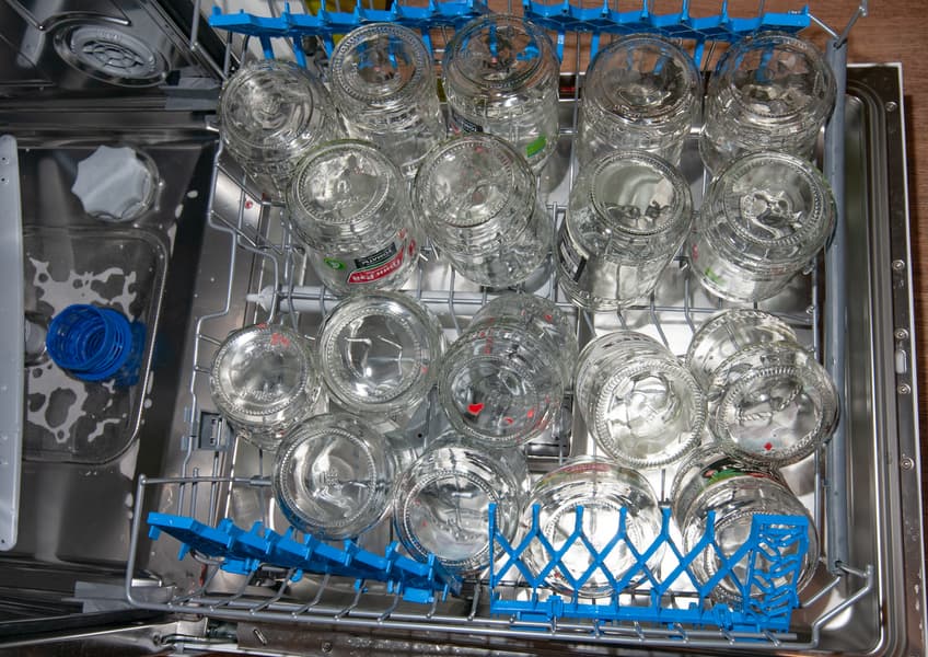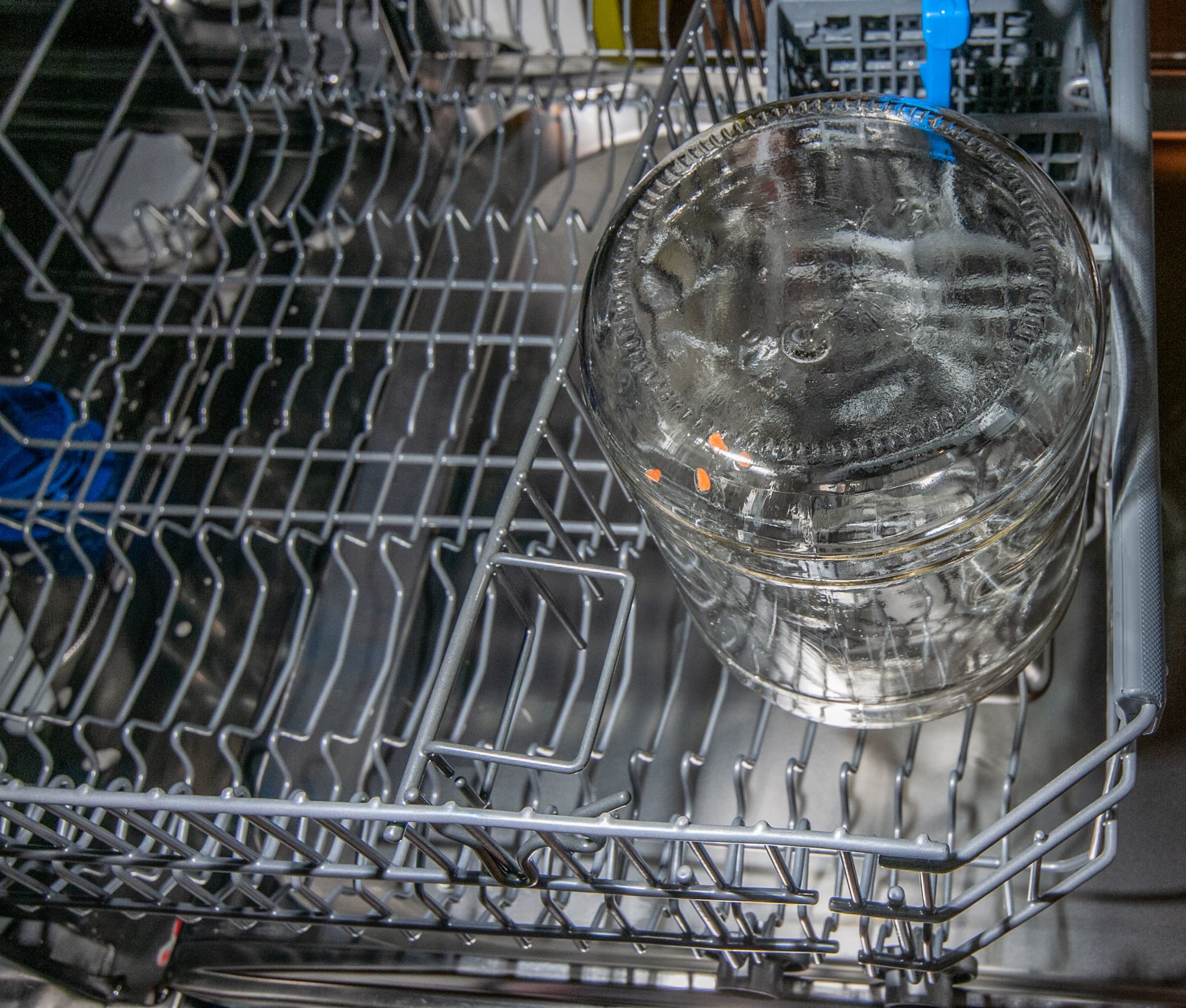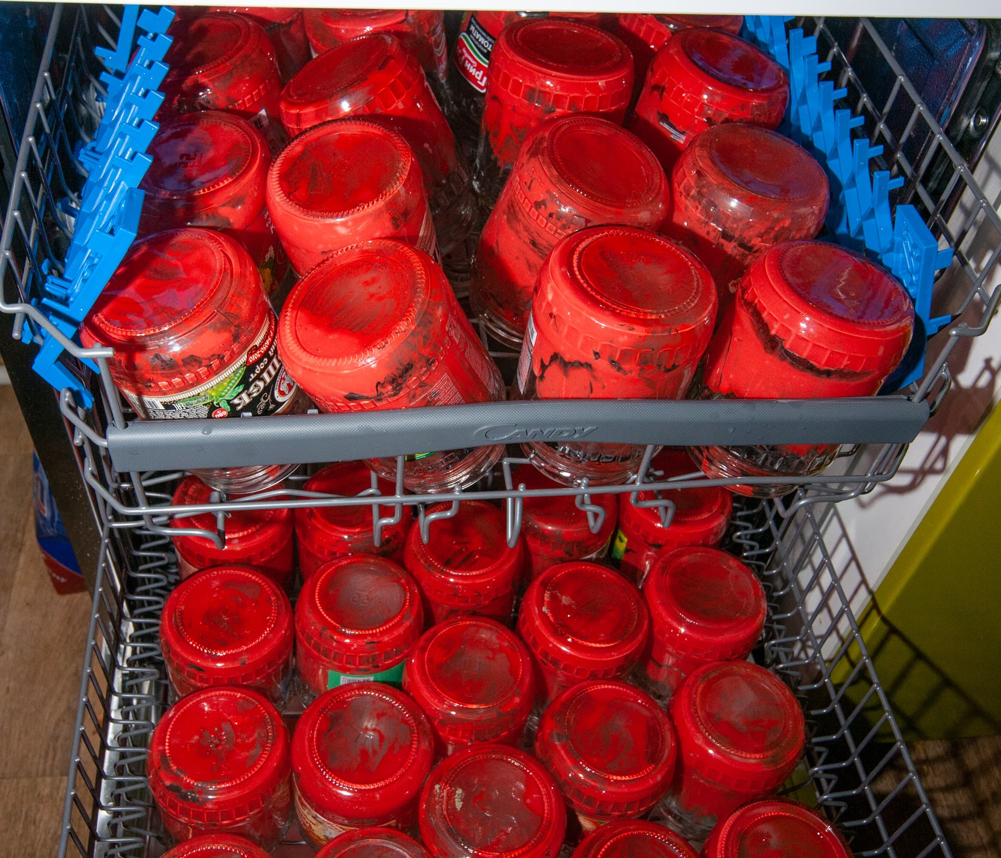 Мы взяли 41 стандартную (650 мл) стеклянную банку одинаковой высоты. Намазали на дно и нижнюю часть внутри банки мучной клейстер с красителем, подождали три часа, чтобы он подсох. Заполнили посудомоечную машину банками в один слой, положили таблетку референсного моющего средства и поставили на режим Р5 (ежедневная мойка).