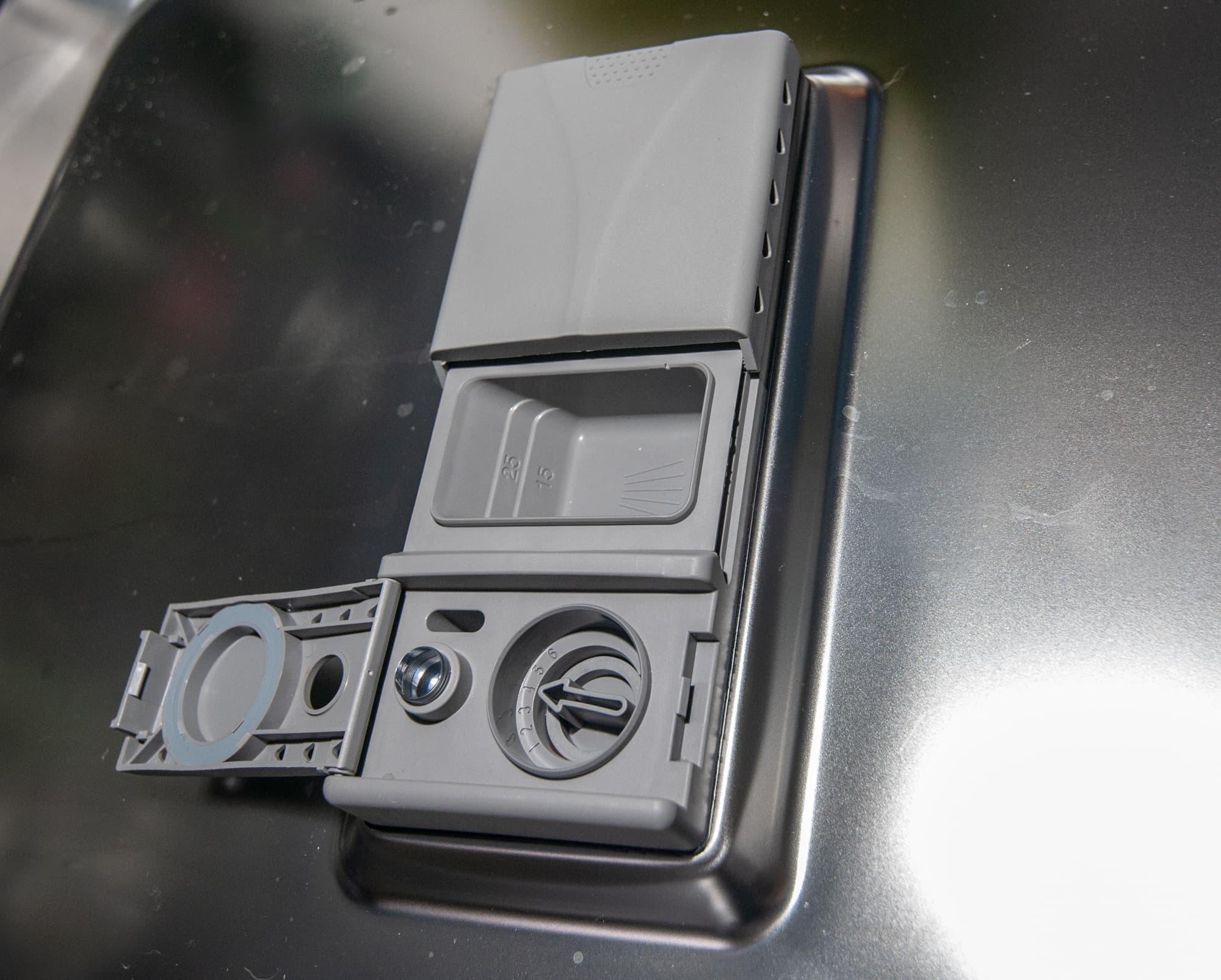 Отделение для моющего средства состоит из двух отсеков — под моющее средство и для ополаскивателя, с индикатором его наличия. Отсек предназначен для жидкого моющего средства, порошка или таблетки. Для более эффективного использования таблеток для посудомойки предусмотрена специальная добавочная программа, запускающаяся клавишей «Tabs» на приборной панели.