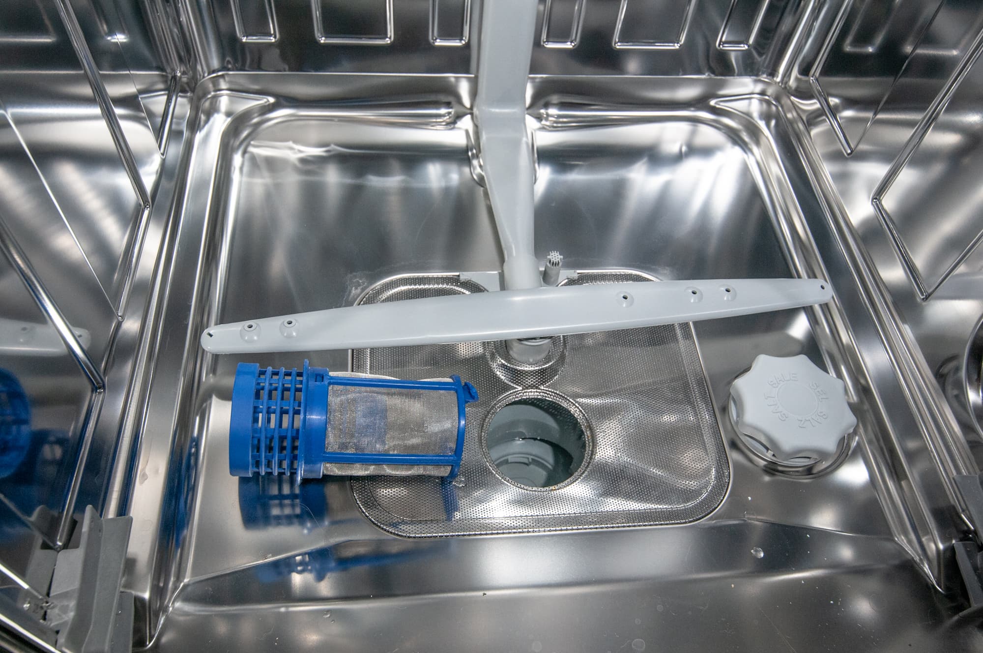 Снизу камеры есть самоочищающийся фильтр тройной очистки и отделение под соль. Фильтр легко вынимается и вставляется, фиксируется поворотом. Специальная конструкция позволяет легко улавливать и удерживать крупные части мусора и мелкие остатки пищи. Добраться до фильтра и отделения для соли можно, вытащив нижнюю корзину из посудомойки.