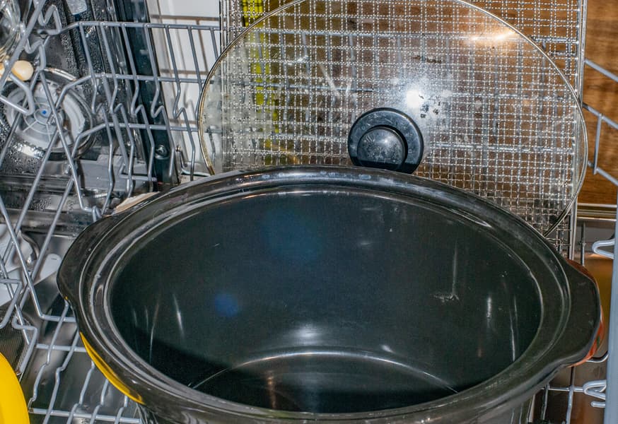 Мы взяли керамическую латку на 9 литров из-под тушеного мяса, загрузили ее, крышку от нее и пару металлических сеток в нижнюю корзину.
