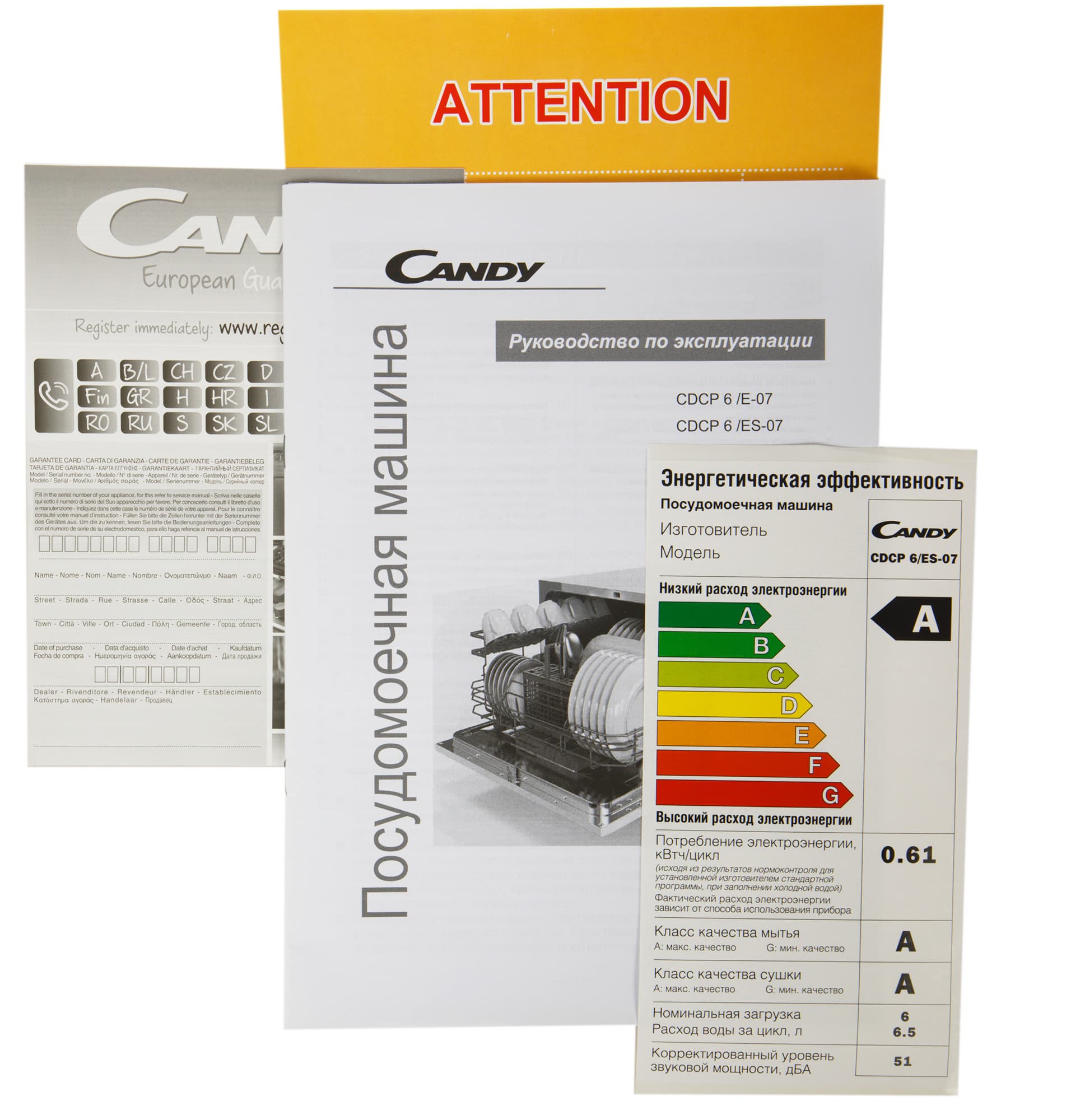 Продолжительность работы программ у Candy CDCP 6/ES-07 фиксированная. Она не зависит от степени загрязнения посуды и также соответствует тому, что написано в инструкции.