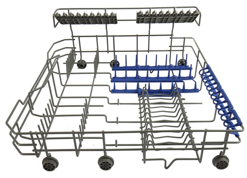 Корзина для посуды покрыта темно-серой эмалью. Ее передняя половина предназначена для блюдец и десертных тарелок, а большим отведена правая задняя четверть. На дальней стенке есть дополнительные пластиковые упоры. Крупную посуду — кастрюли, банки и контейнеры — надо ставить в левую заднюю четверть. Емкость снабжена также двумя откидными полочками для чашек и длинных кухонных приборов. На торцах полочек — держатели для ножек бокалов.