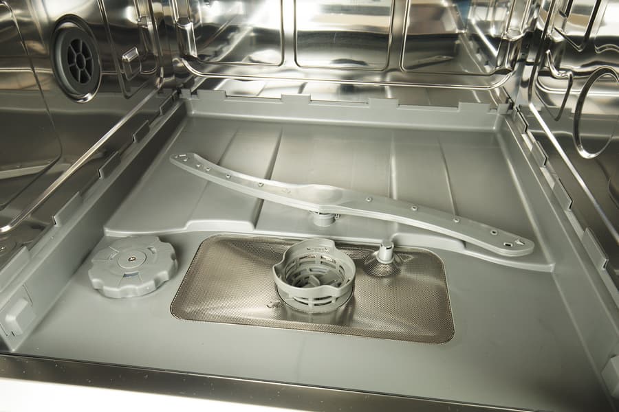 Стенки и «потолок» бака нашей посудомойки выполнены из нержавеющей стали, поддон же пластиковый. Под корзиной находятся разбрызгиватель традиционной конструкции (у этой модели он один), съемный фильтр и отсек для соли.