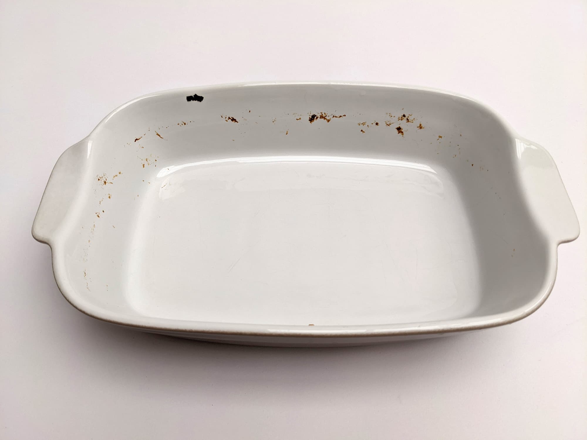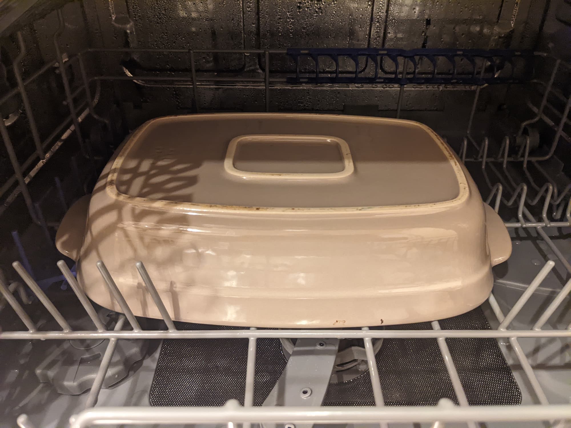 Тестировать посудомойку для нас означает, что в меню будет запеканка — для программы отмывания интенсивных загрязнений лучше всего подходит керамическая форма, в которой готовили жирное мясо со сметанным соусом. А после того, как еду мы переложили в контейнер, форму поставили в духовку еще на 15 минут — до появления стойкой корки.