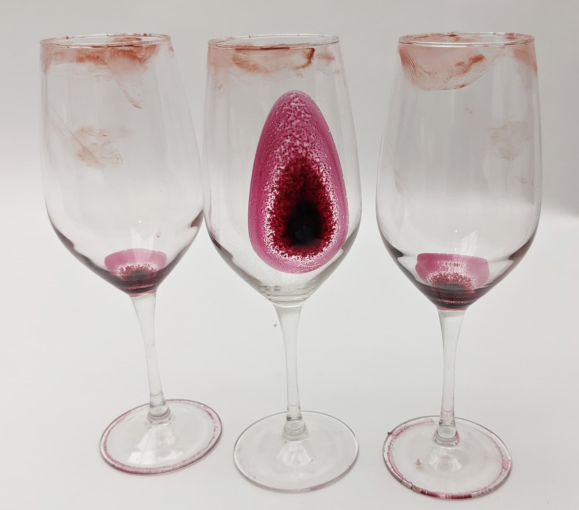 Это еще один очень красочный тест, выдающий в нас подлинных художников. На этот раз холстом для шедевра служат тонкие стеклянные бокалы, а красками на нашей палитре — жирная губная помада снаружи и красное вино изнутри. Всю эту имитацию бурной вечеринки мы оставили сохнуть на стандартные 24 часа: как будто хозяева запустили посудомойку после огненной субботы только вечером воскресенья.