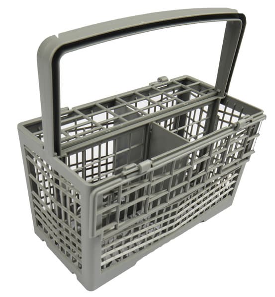Серая пластиковая корзинка для столовых приборов устанавливается в центре передней половины емкости. Откидные крышки-упоры позволяют аккуратно расставить вилки, ложки и ножи в их отверстия или, откинув, сложить их кучей — как кому удобнее.