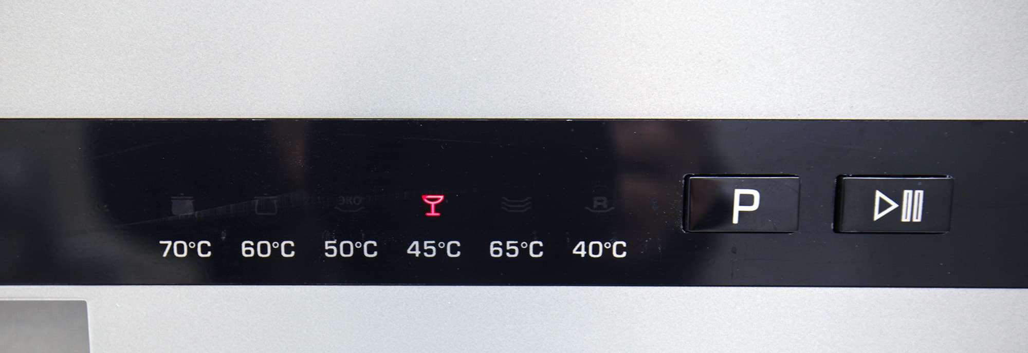 Программ у нашей посудомойки шесть, они перебираются последовательным нажатием на кнопку «P»: