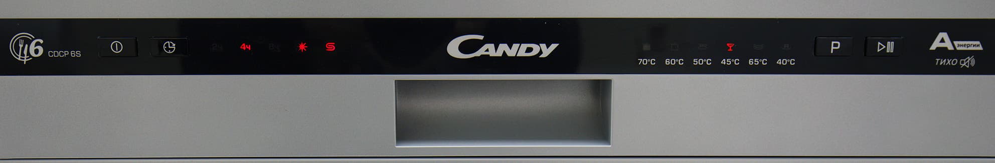 Панель управления посудомоечной машиной Candy CDCP 6/ES-07 визуально разделена надвое логотипом производителя.