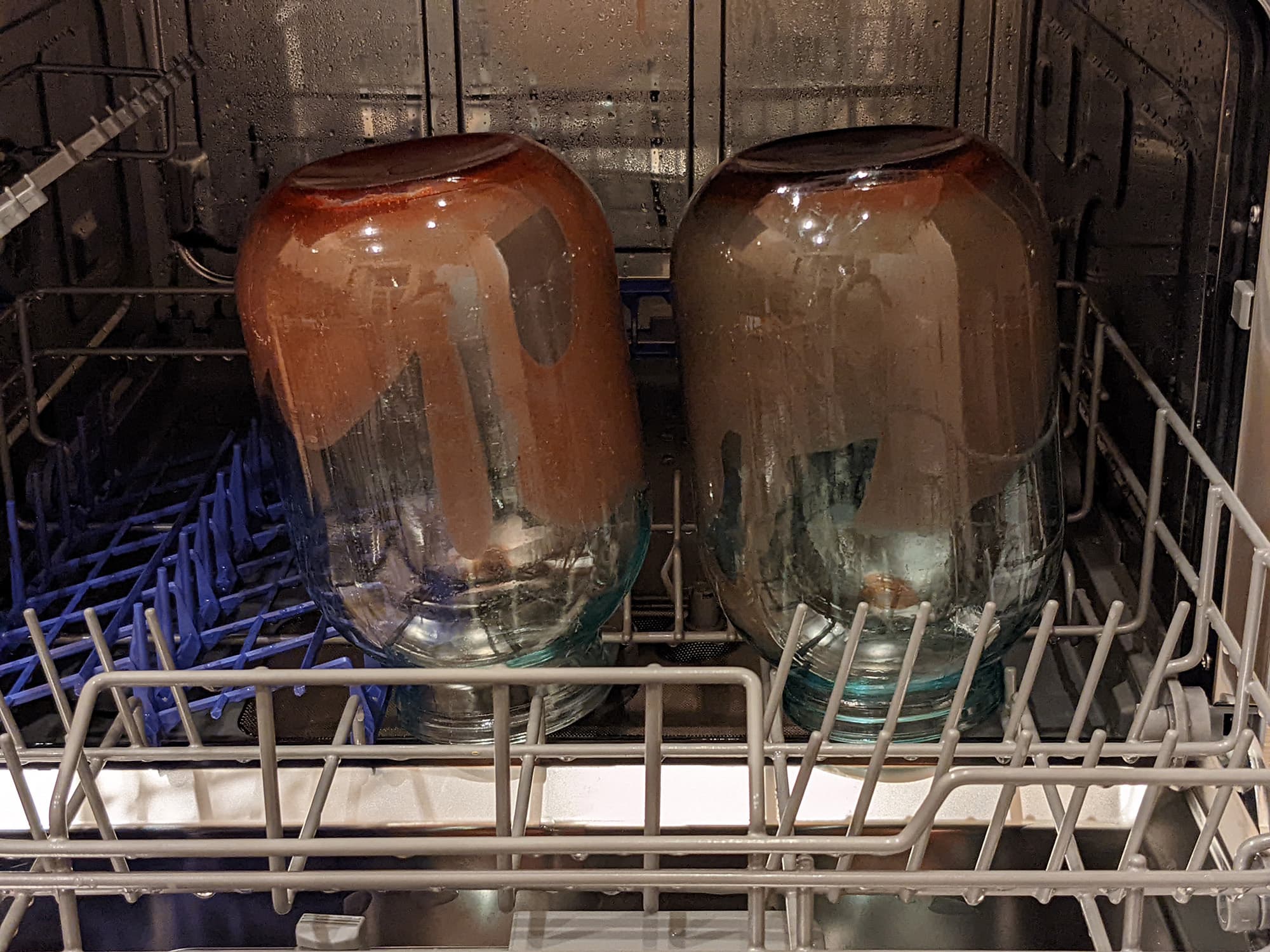 Для тестирования программы «Ежедневная мойка» мы взяли две двухлитровые банки, обильно запачкали их изнутри кетчупом (на этот раз без майонеза) и дали высохнуть в течение суток.