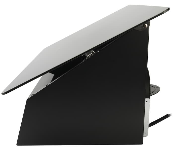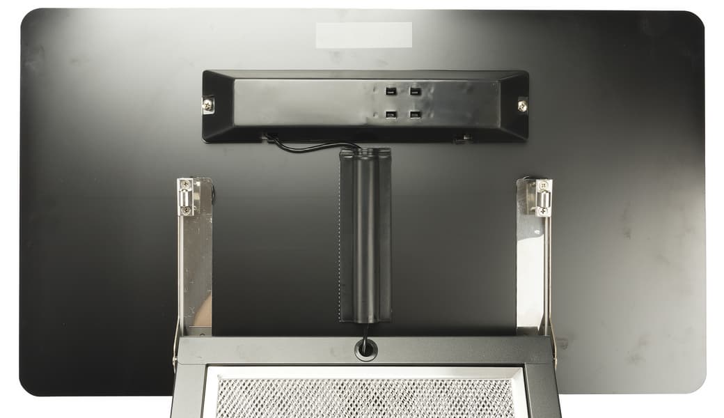 Верхняя часть стеклянного экрана закреплена на двух металлических петлях, обеспечивающих открывание примерно на 120°. С тыльной стороны панели имеется две защелки, с помощью которых экран фиксируется в закрытом положении.