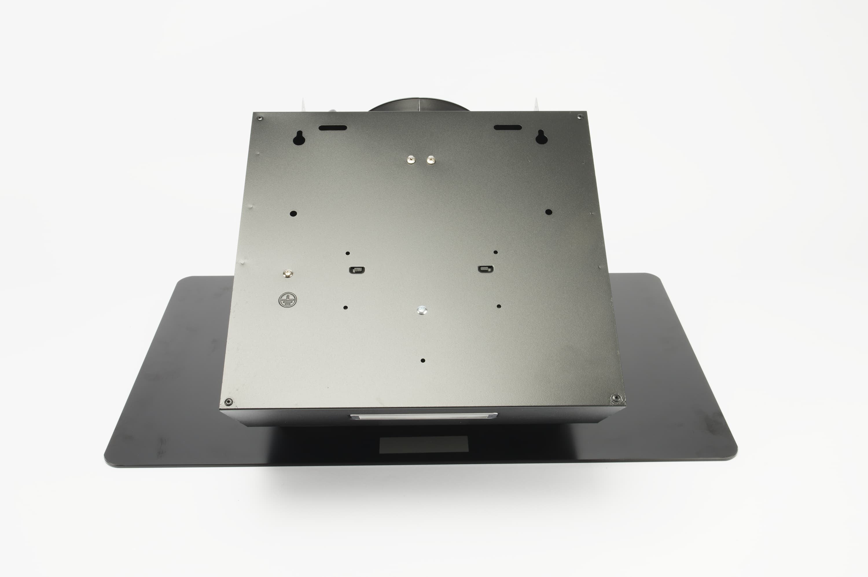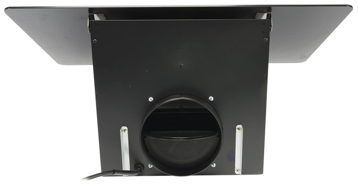Верхняя часть этой модели сделана из металла, окрашенного в черный цвет, и при монтаже скрывается за декоративным кожухом. На ней есть выходное отверстие диаметром 150 мм с установленным невозвратным клапаном с двумя лепестками.