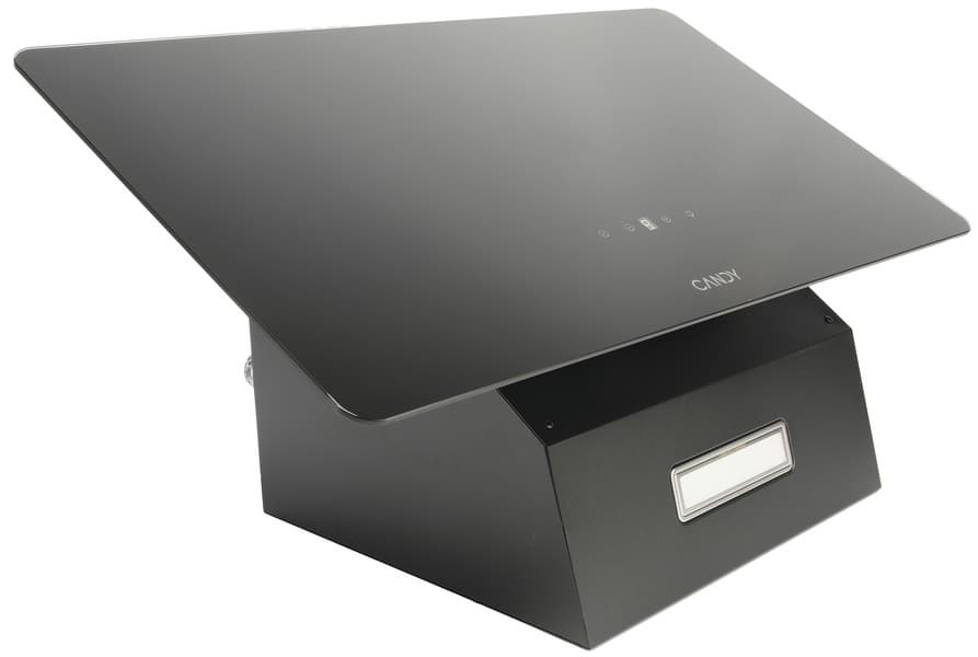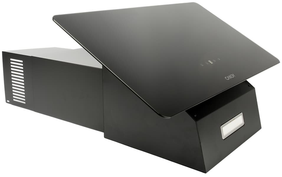 Форм-фактор стандартный: спереди расположен откидывающийся вверх стеклянный экран, под которым скрывается квадратный антижировой фильтр. В нижней части экрана имеется лишь логотип Candy.
