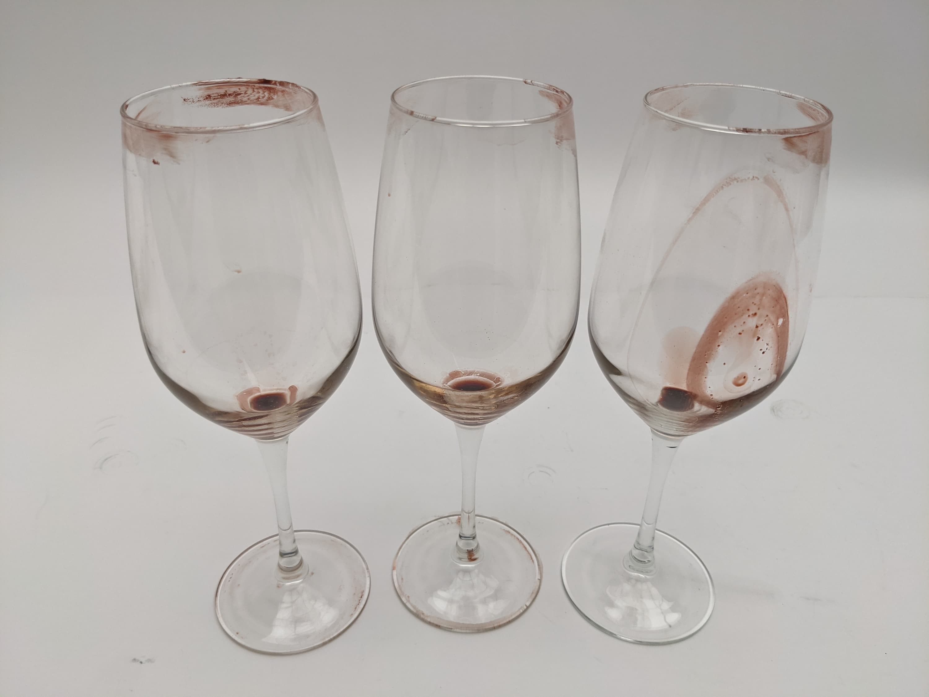 Несколько тонких стеклянных бокалов, щедро вымазанных со всех сторон жирной губной помадой и испачканных изнутри красным вином мы также оставили сохнуть на 24 часа. Предположим, что после шумной вечеринки с утра хозяева ушли на работу, а вернулись в весь этот ужас только поздно вечером.