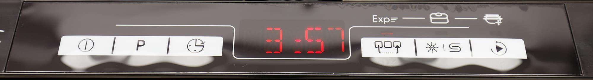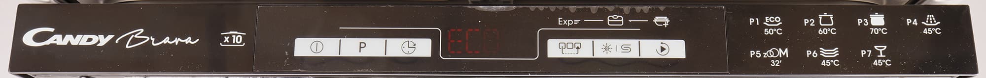 Панель управления Candy CDIH 2D1047-08, как и у всех полновстраиваемых ПММ, размещена на верхнем торце откидной дверцы. После установки в кухонный гарнитур она доступна только если машину открыть.