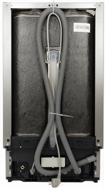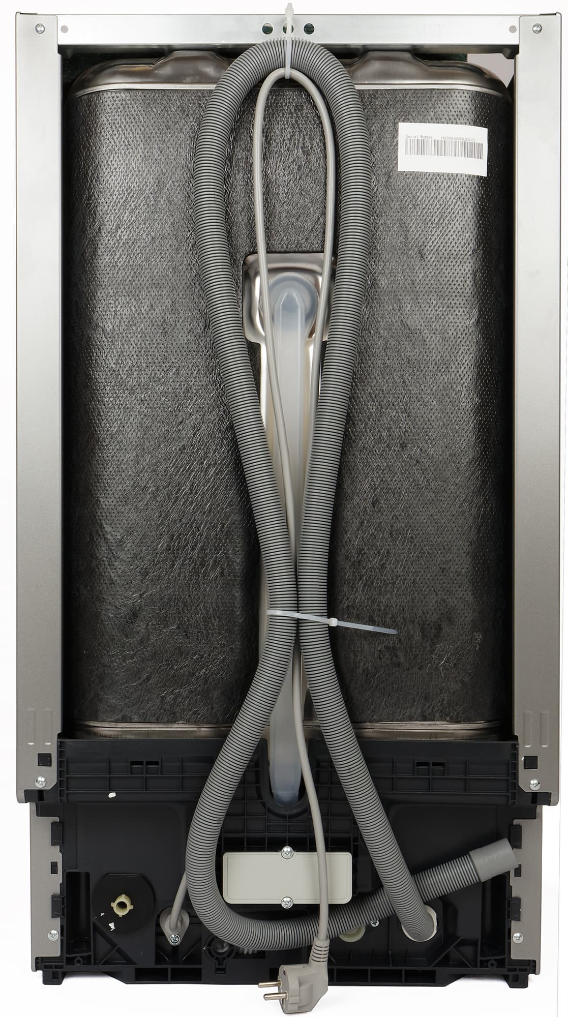 Гофрированный сливной шланг у машины несъемный, стандартной конструкции. Заливной шланг, оборудованный системой AquaStop, подключается к пластиковой водорозетке в левом нижнем углу задней панели. Полупрозрачная трубка, через которую подается вода на верхние импеллеры, вынесена на наружную сторону корпуса: такое компоновочное решение мы встречаем нечасто.