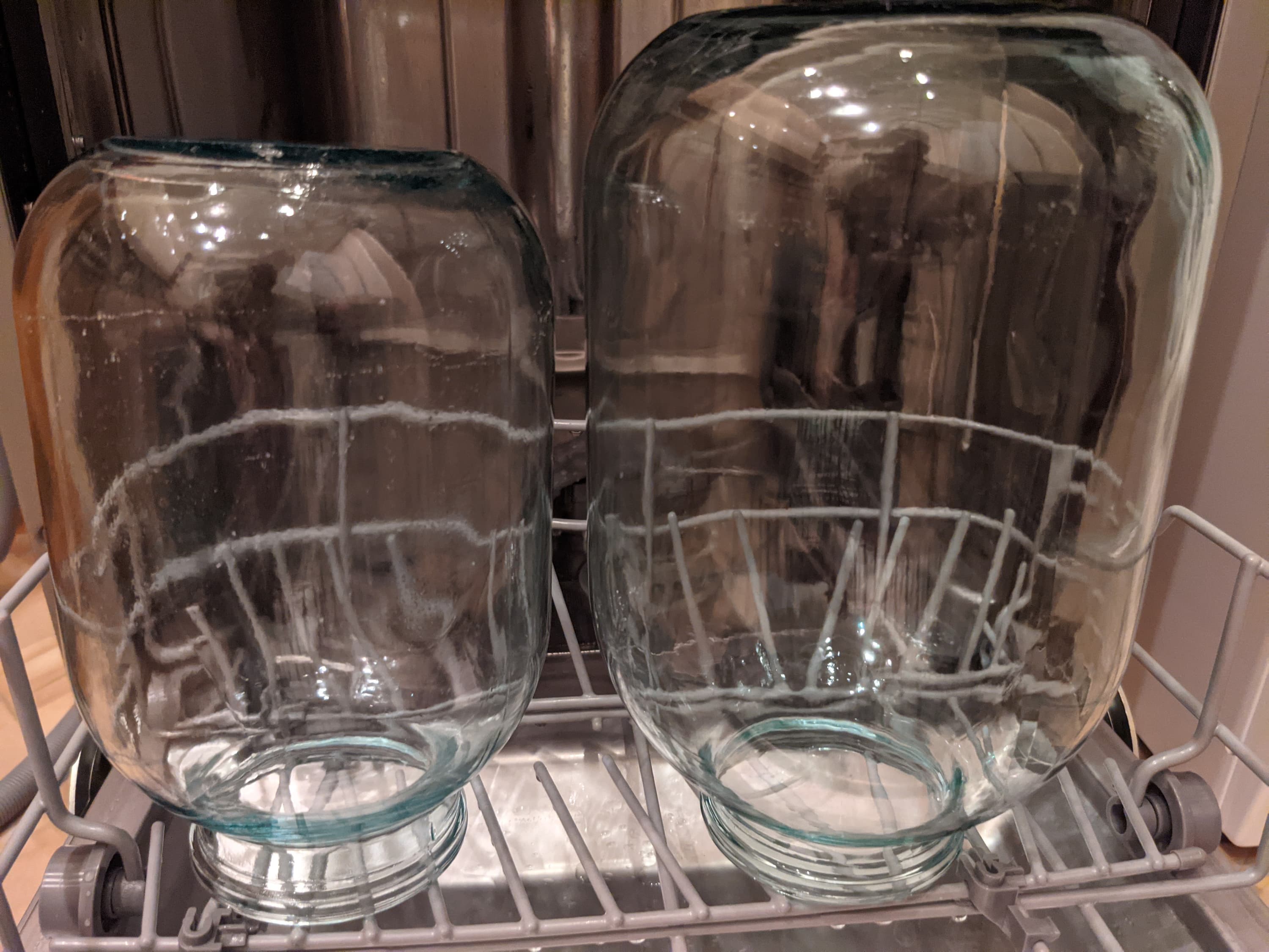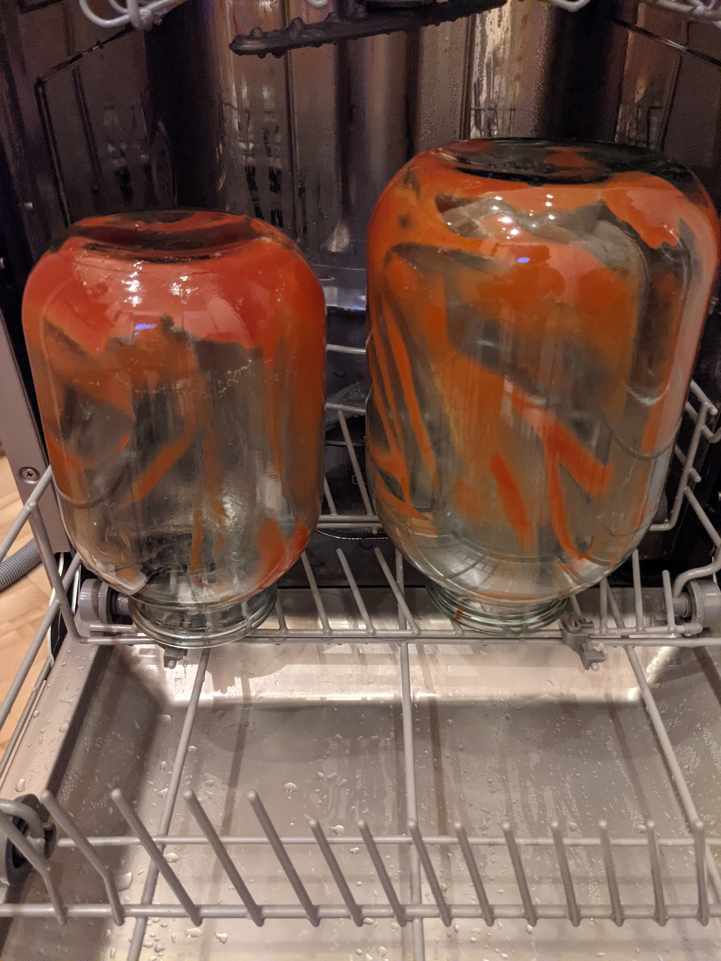 И снова с нами наши верные помощницы — трехлитровая и двухлитровая. Мы испачкали стеклянные банки кетчупом изнутри и оставили на сутки сохнуть.