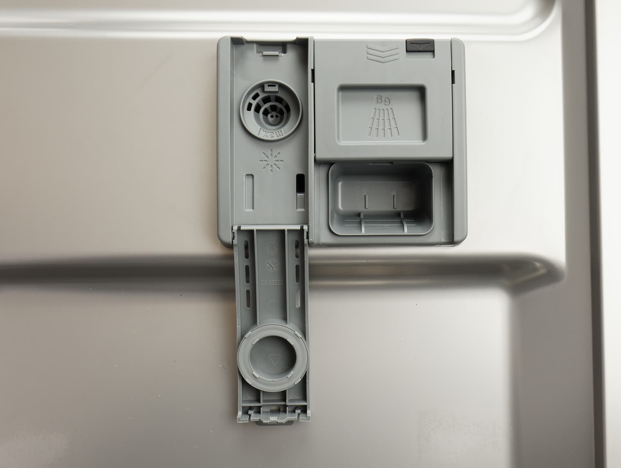 Контейнер для моющих средств на дверце ничем не отличается от таких же у других моделей. Большой отсек — для жидких, порошковых или таблетированных моющих средств, а маленький с крышкой другой формы — емкость для ополаскивателя.