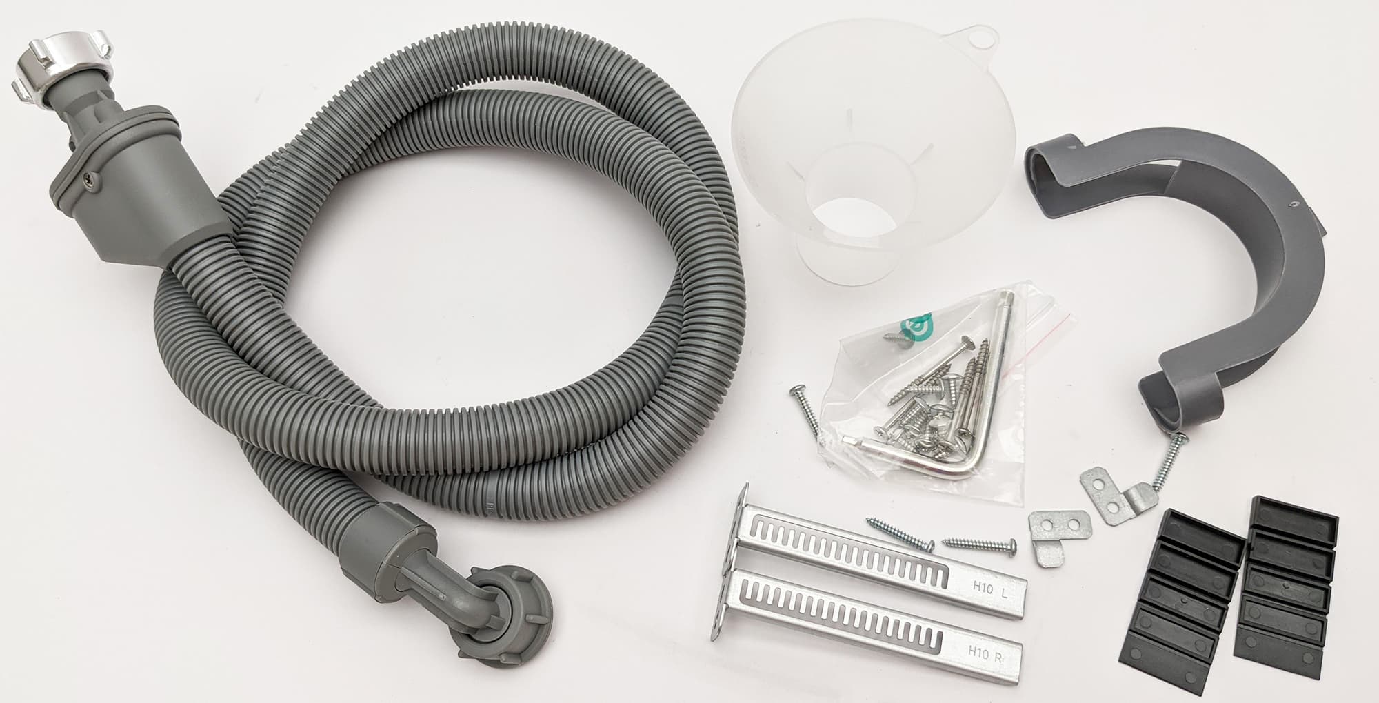Подключение посудомойки не отличается от большинства рассмотренных нами аналогичных приборов: сливной гофрированный шланг надо подключить к канализации, а заливной с клапаном AquaStop — к системе водоснабжения.