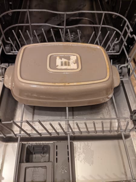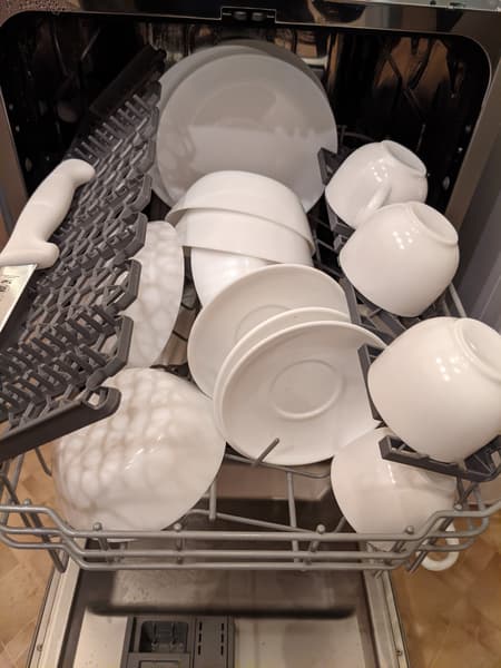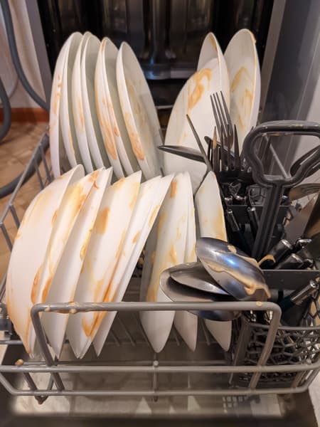 На посуде смесь распределена равномерно, но небрежно. Для полного эффекта загруженная и открытая посудомойка сутки постояла с посудой.