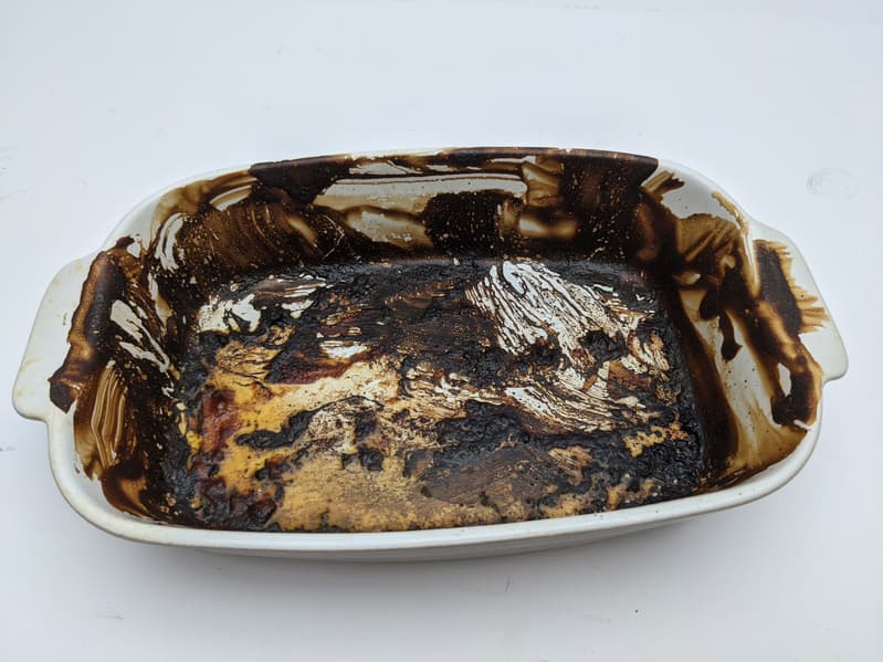 Для теста программы отмывания интенсивных загрязнений мы взяли керамическую форму, в которой запекалось жирное мясо со сметанным соусом. Дополнительно остатки еды прижарили еще в течение 15 минут — до стойкой корки.