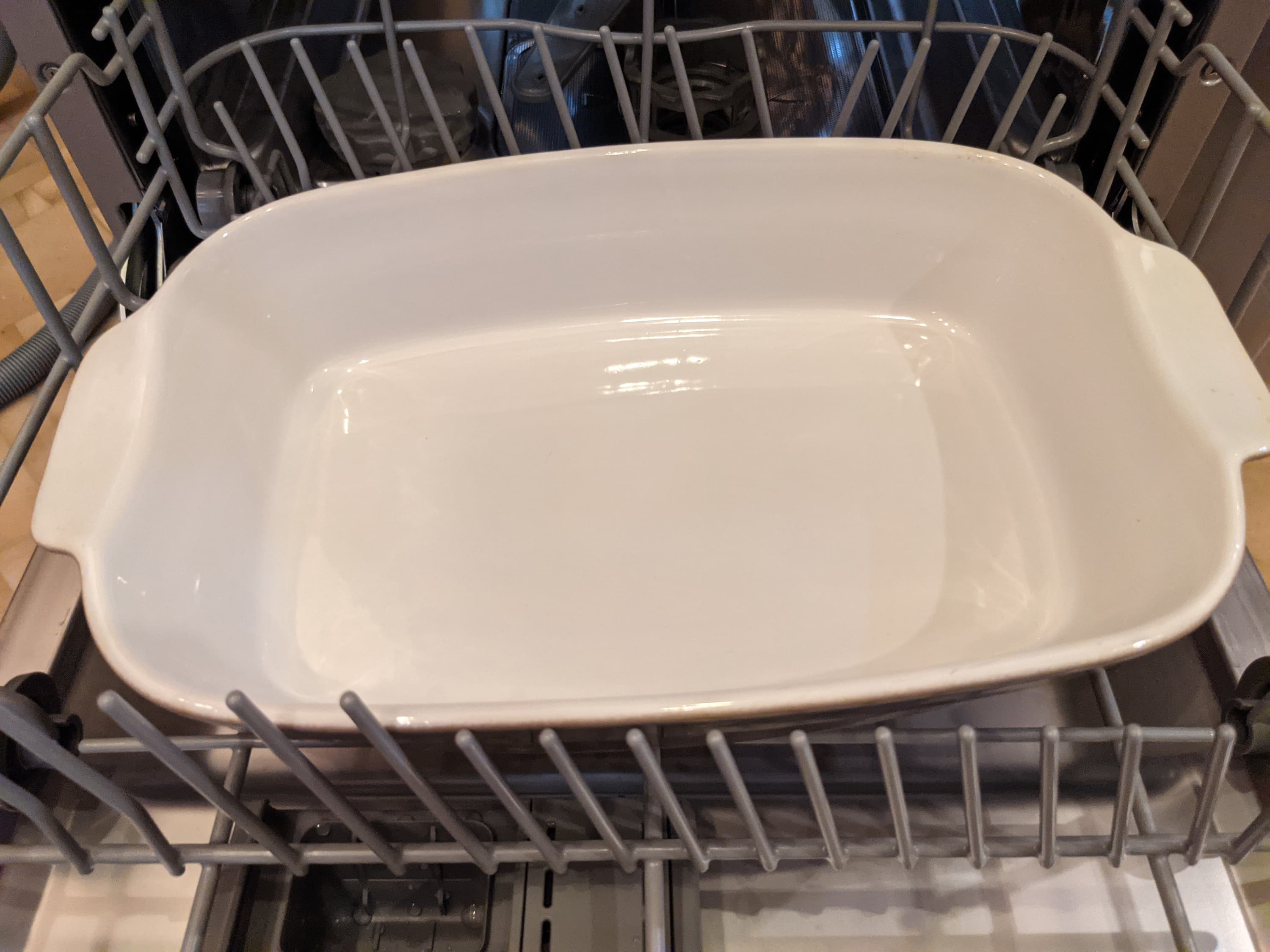 Наверное, есть на свете люди, которые пытаются отмыть такую посуду сразу, но в обычной жизни хорошо бы ее замочить. Но мы этого никогда не делаем. Так и сунули форму, как была, в нижнюю корзину и включили программу P3 (Интенсивная мойка).