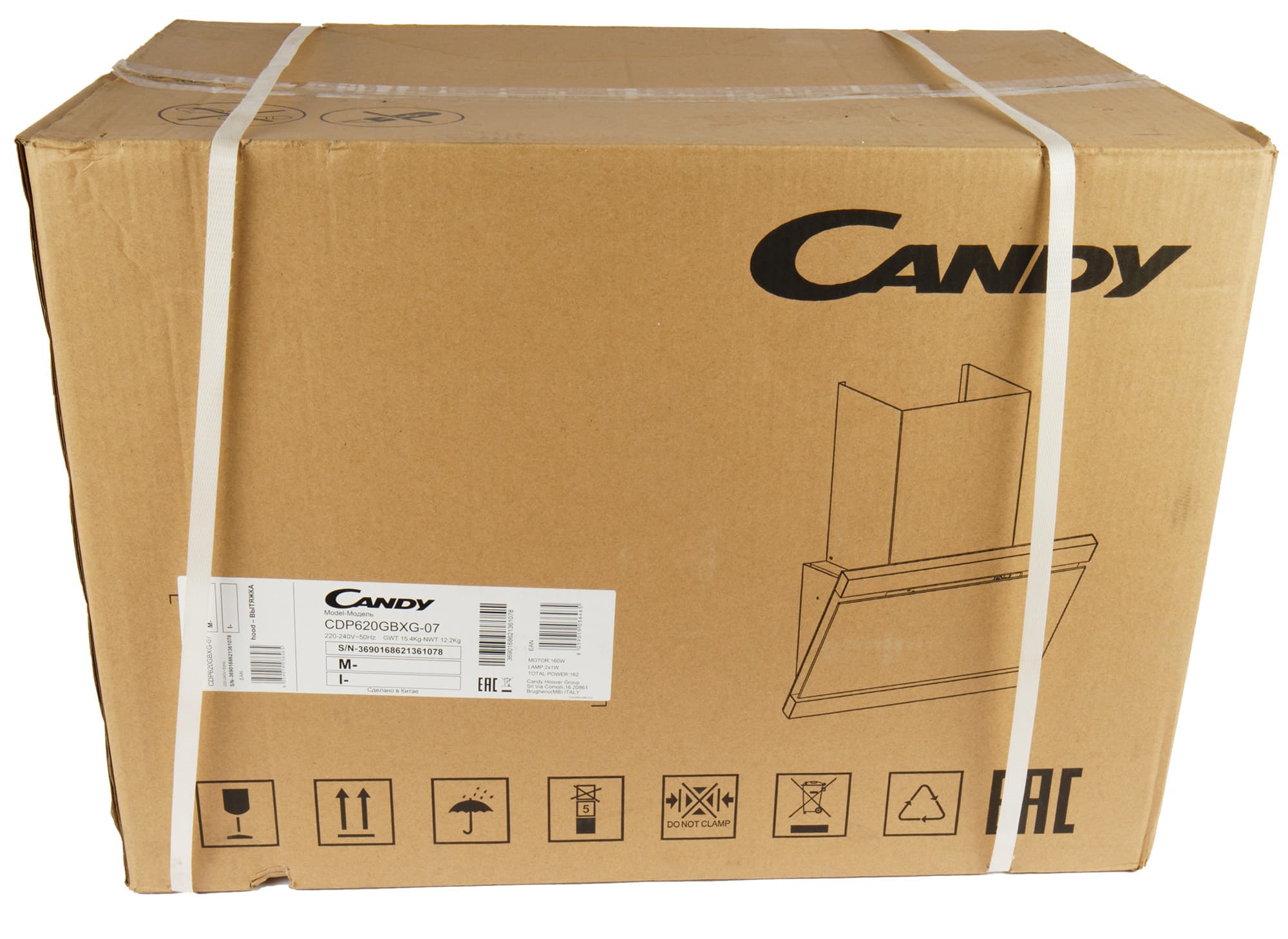 Наклонная кухонная вытяжка Candy CDP620GBXG-07 наиболее популярной для приборов такого рода ширины — 60 сантиметров. Разрабатывая эту модель, дизайнеры взяли за основу черный цвет с добавками серебристого.