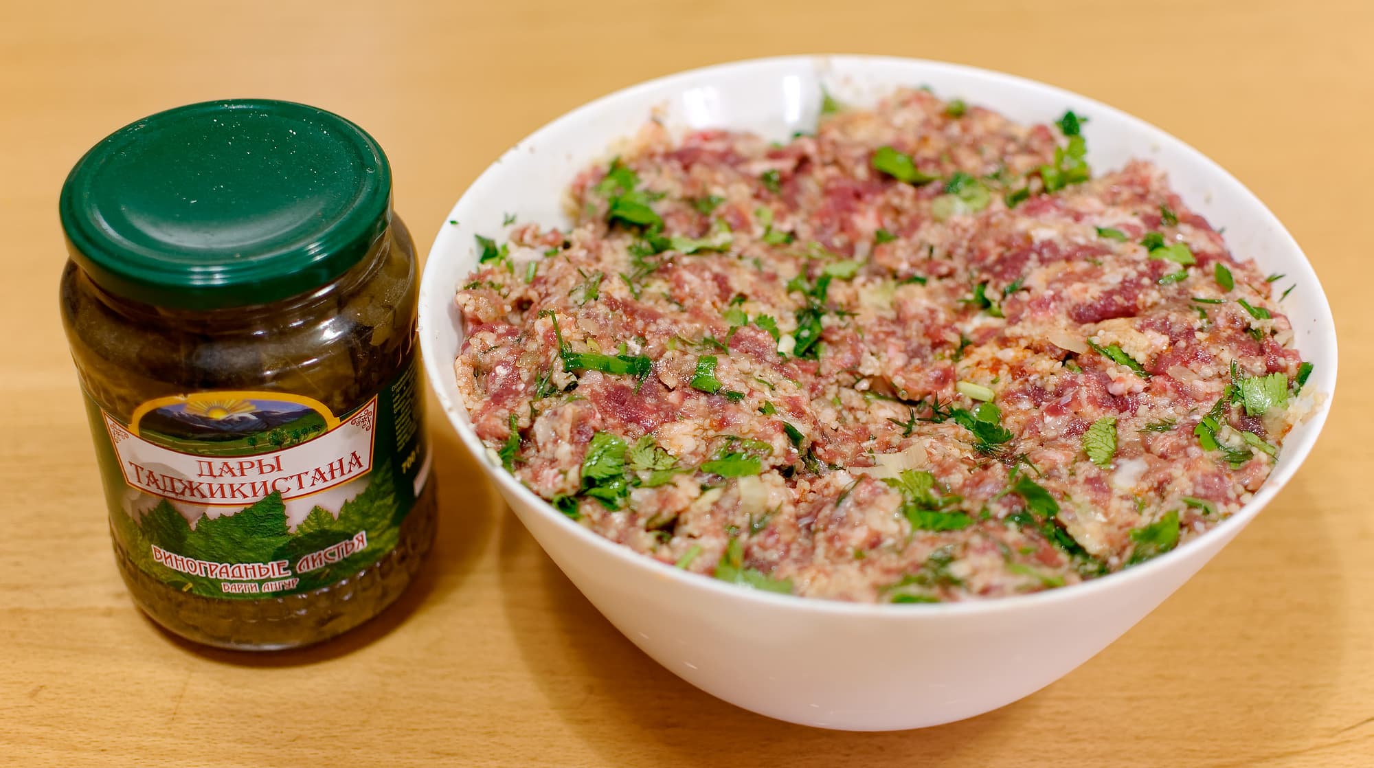 Сначала мы взяли фарш из жирной говядины, добавили к нему много зелени и стакан кускуса. Также подготовили банку с виноградными листьями.