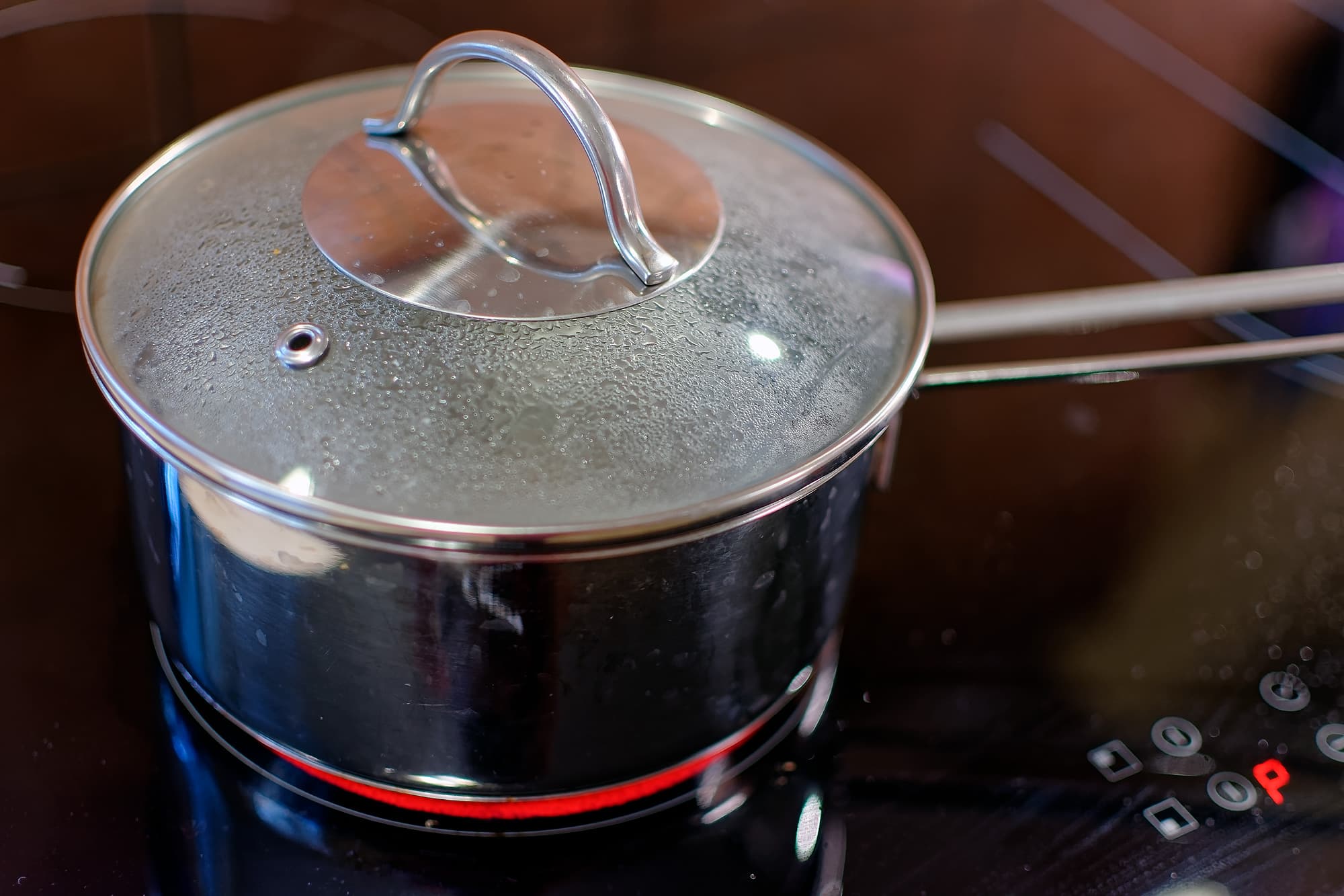 Для большой конфорки мы взяли металлическую кастрюлю с диаметром дна 22 см (диаметр конфорки 19 см), также закрытую крышкой. Придонное кипение началось через 7 минут 10 секунд, уверенное — через 8 минут. При этом между придонным и уверенным опять сработала термозащита, но ненадолго — буквально на 3-5 секунд.