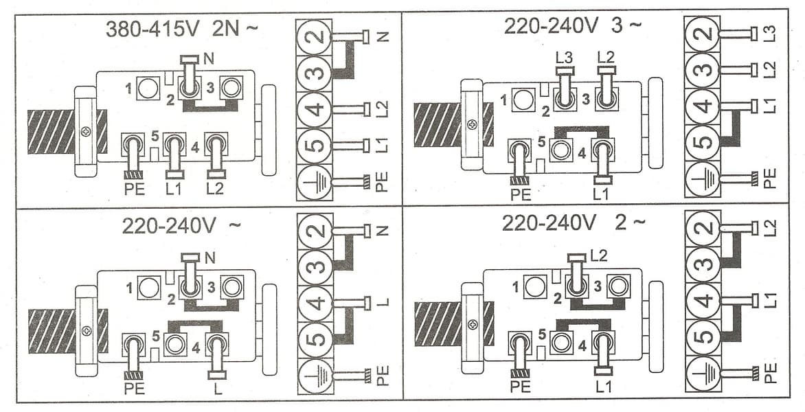 По умолчанию подключение рассчитано на однофазную сеть 220-240 вольт, соответственно, синий провод — нейтраль, коричневый — фаза, желто-зеленый — земля. Также возможны варианты двухфазного подключения 220-240 В (ничего менять не нужно), трехфазного 220-240 В и трехфазного 380-415 В (придется перевинтить клеммы со стороны варочной панели).