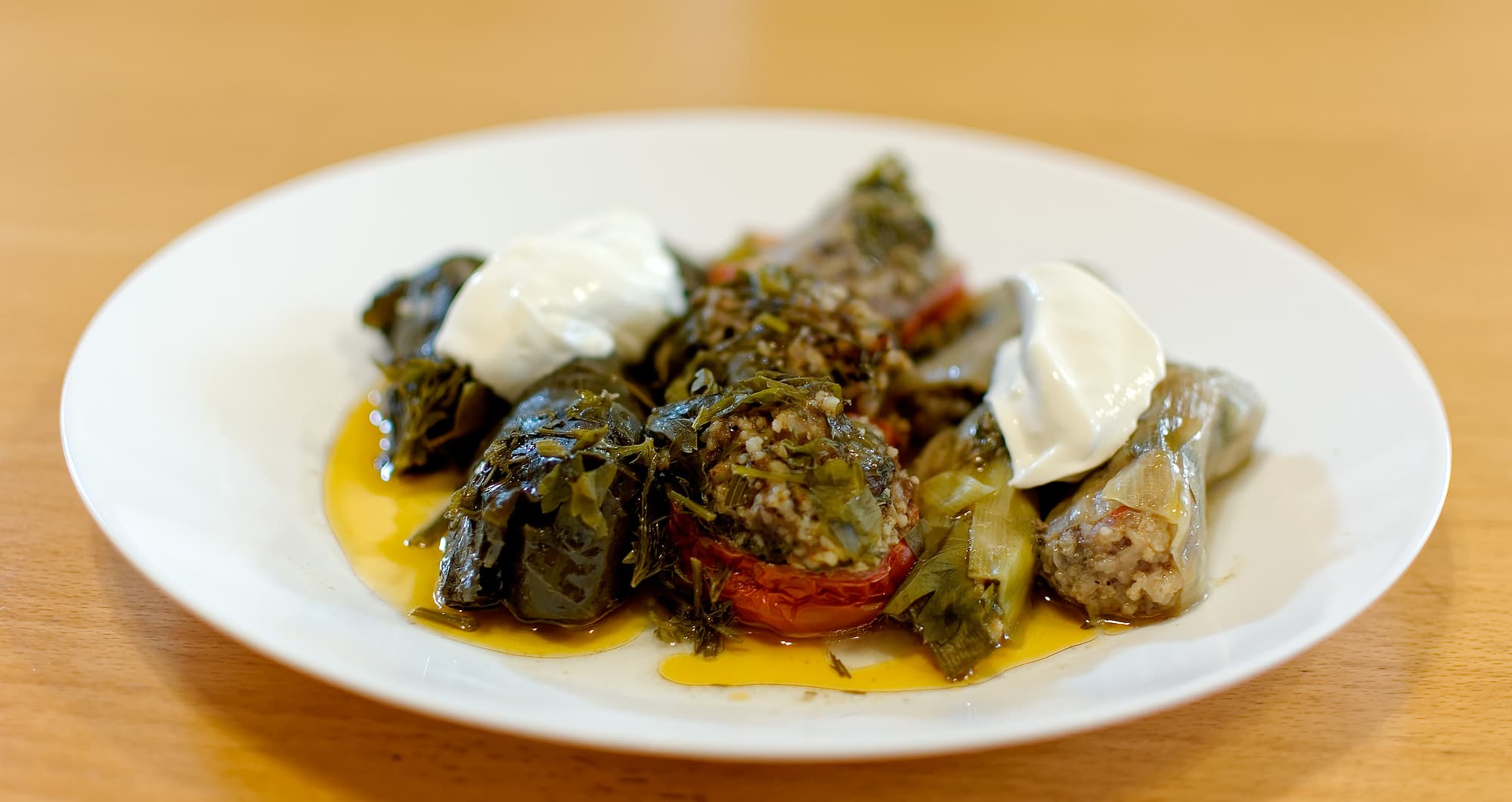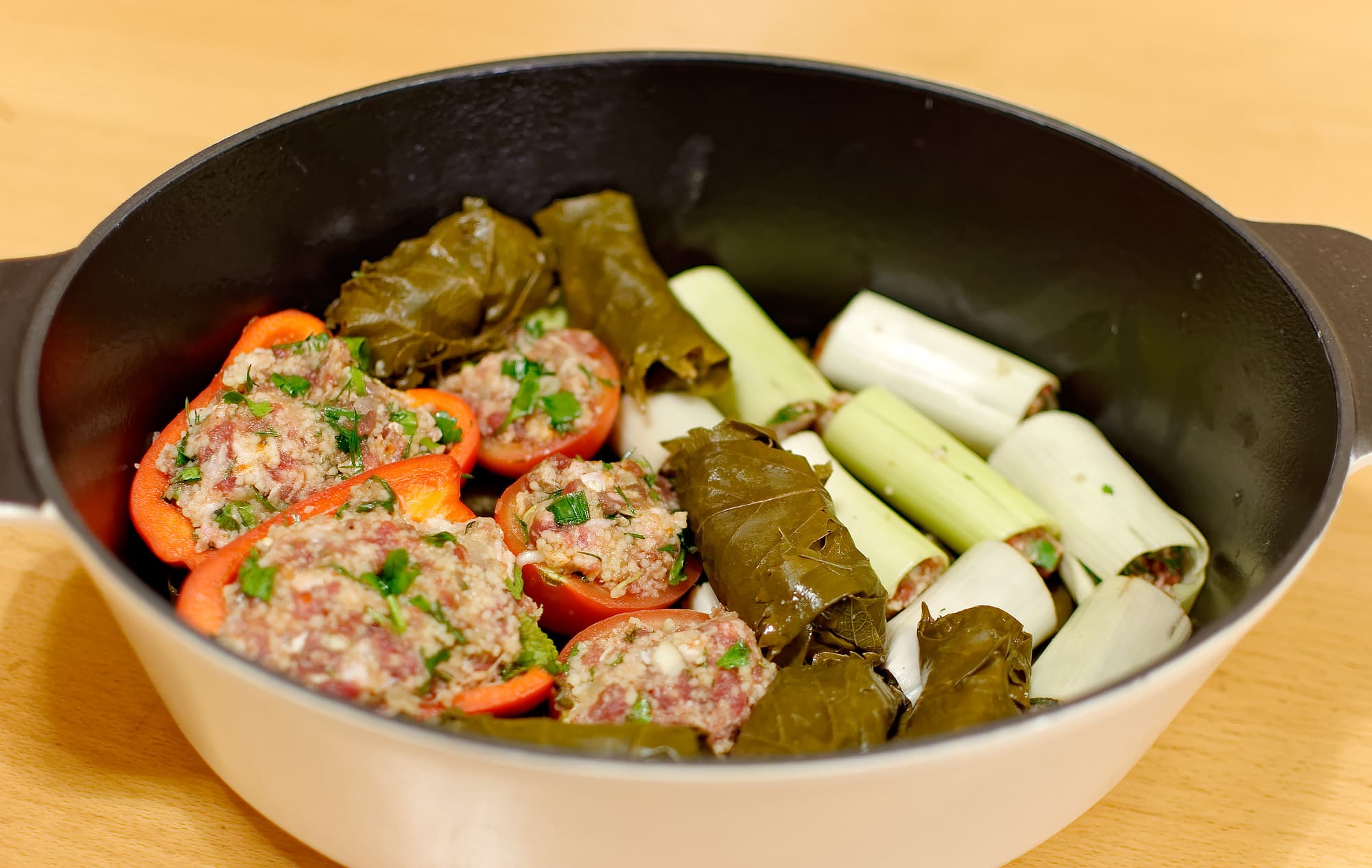 Поскольку мы планировали тестировать функцию моста, посудина была взята длинная и объемная, так что листья быстро кончились. Тогда мы нафаршировали порей, множество небольших помидоров и пару перцев.