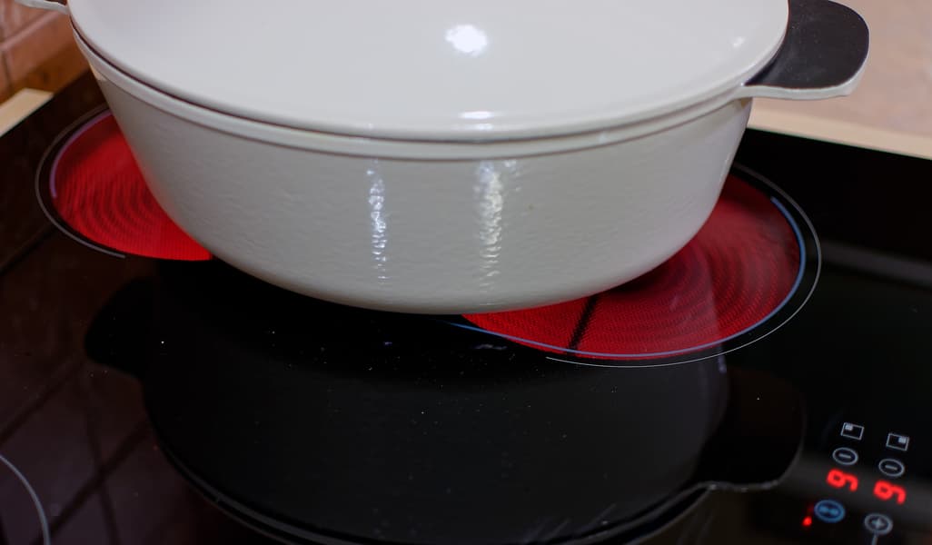 Еще одним разочарованием стала функция «моста» — да, она включает одновременно две конфорки и объединяет управление ими, но... и только. Расстояние между конфорками (4 см) никто не отменял и нагревать его тоже никто не собирается. В результате с продолговатой посудой (для которой, как мы думали, и предназначен «мост»), получается ситуация, как на фото: в середине нагрева нет, а по краям конфорки греют воздух (а еще точнее — нагревают ручки посуды).