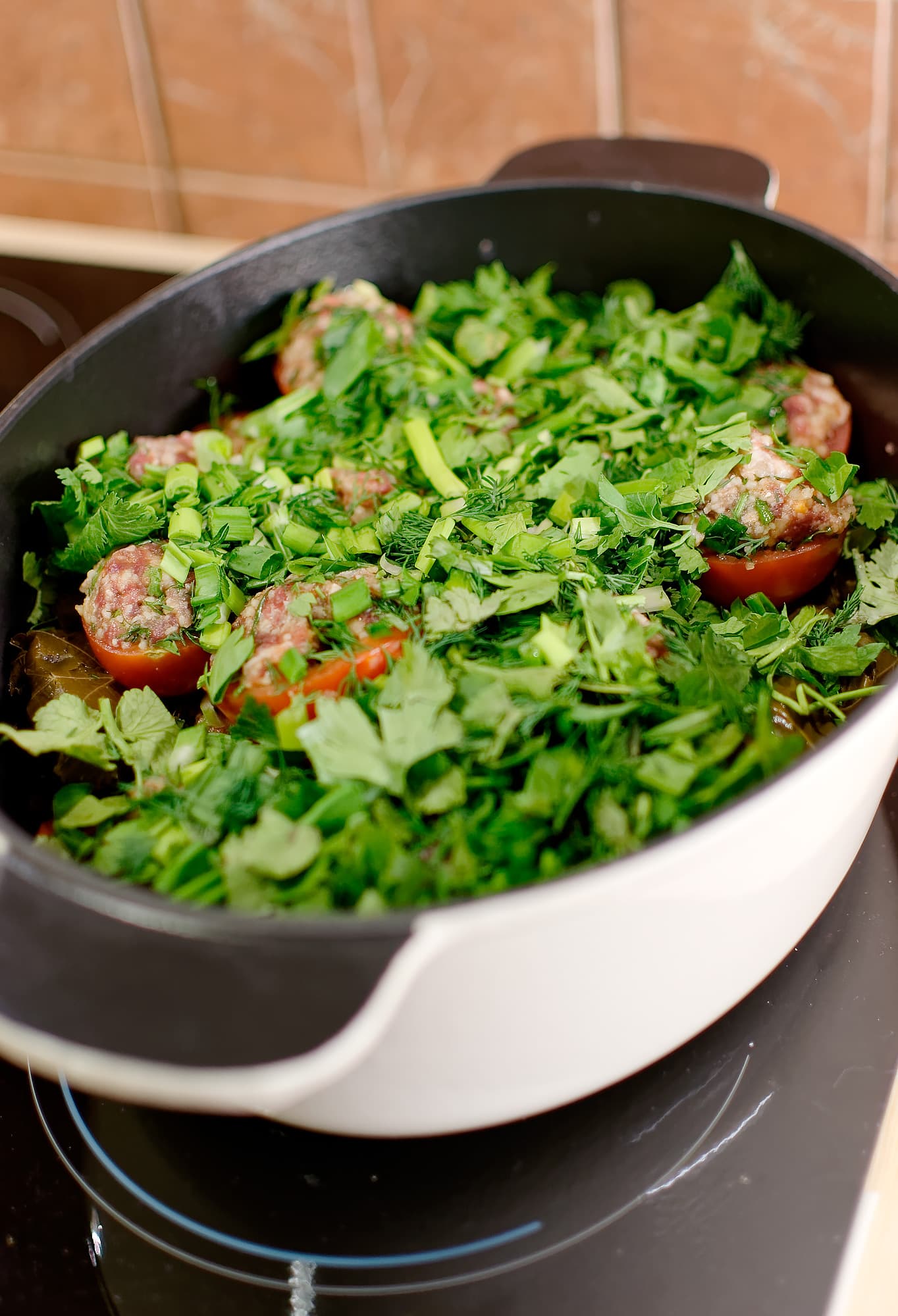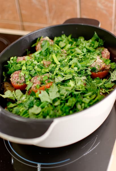 Тогда мы просто поставили нашу латку на центр одной из конфорок. Чугун тяжелый и хорошо сохраняет тепло, поэтому наша долма и так прекрасно протушилась, без всяких дополнительных функций.