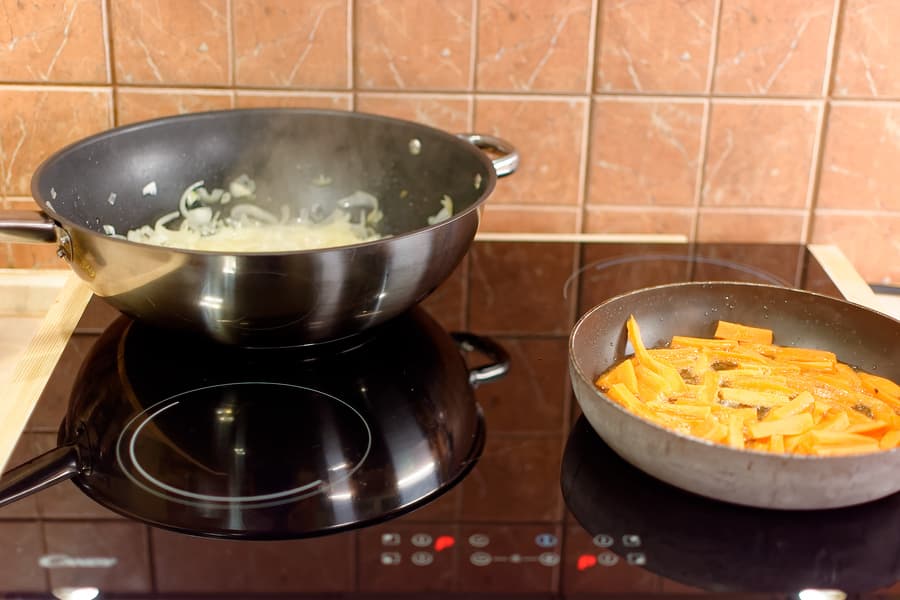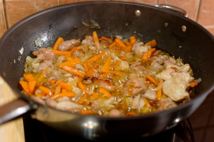 Начать обжарку пришлось на двух сковородках разом: в одной такой объем не жарился, а томился даже на самой высокой мощности.