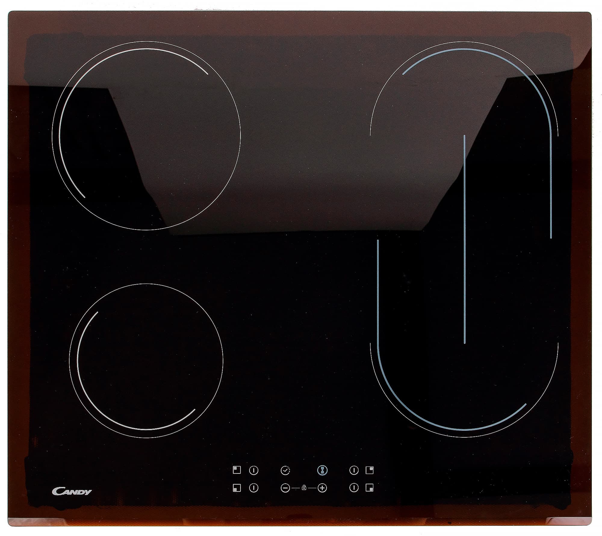 Любая стеклокерамическая плита с сенсорным управлением выглядит более-менее одинаково, и наша сегодняшняя героиня исключением не является. Как правило — это черное (в данном случае на просвет скорее темно-коричневое) стекло, на котором белым цветом «нарисованы» органы управления и очертания конфорок. Именно поэтому такие варочные панели очень легки в уходе: вам просто нужно протереть стеклокерамическую поверхность — и все. Никаких выступов, кнопочек, рычажков и прочего. Просто ровное стекло.