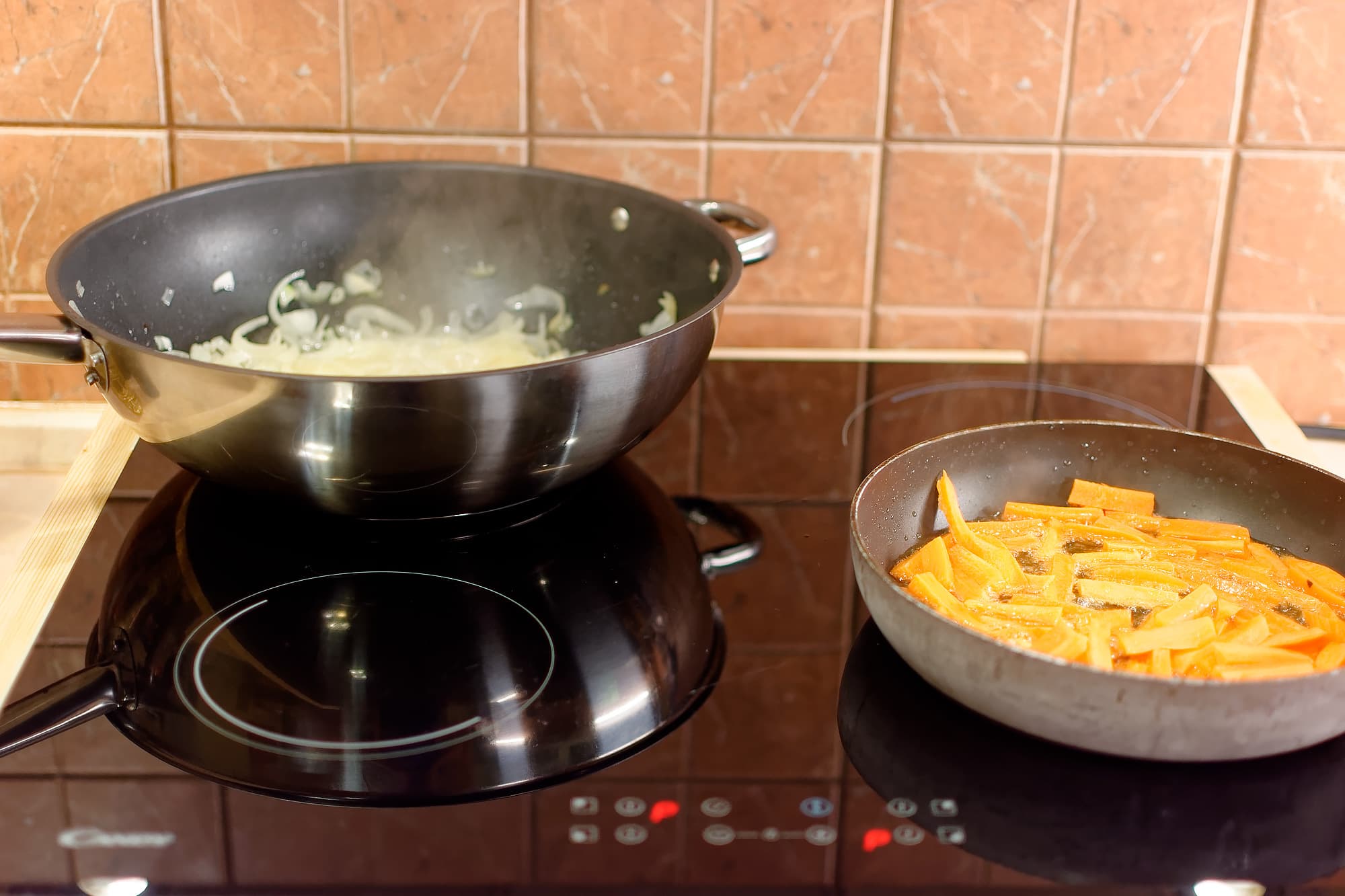 На первом же этапе мы как следует раскалили масло, и опустив в него лук, поняли, что такой объем сразу остудил наше масло. Поскольку это был самый максимальный нагрев из возможных, мы убедились, что не надо ждать чудес и пора создавать их самостоятельно.