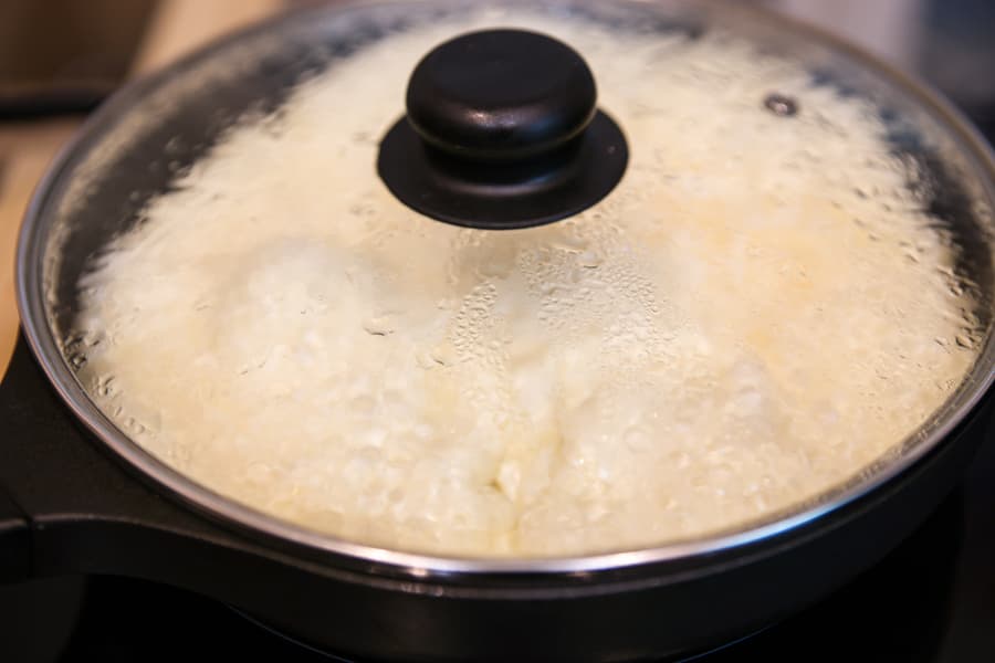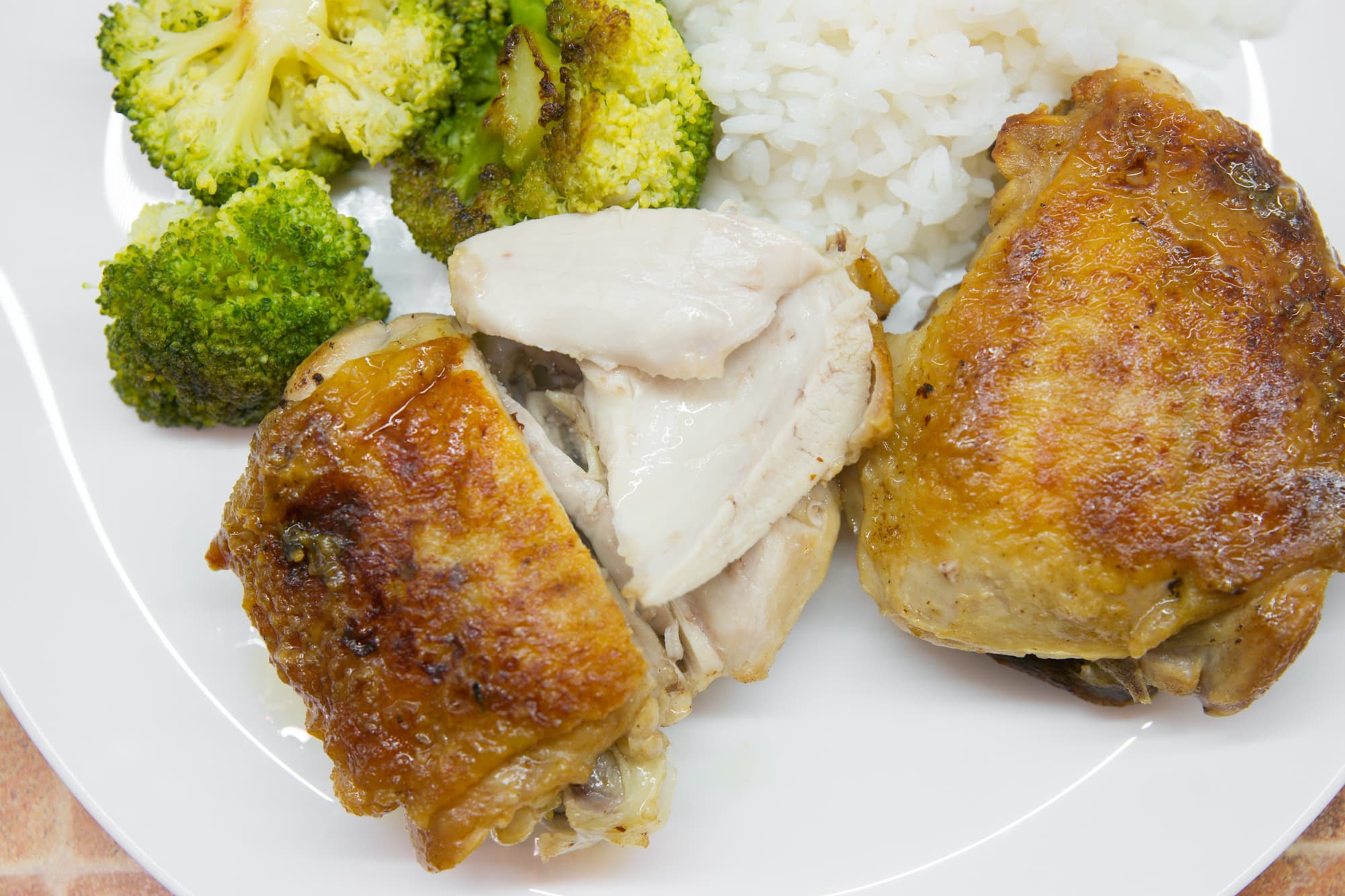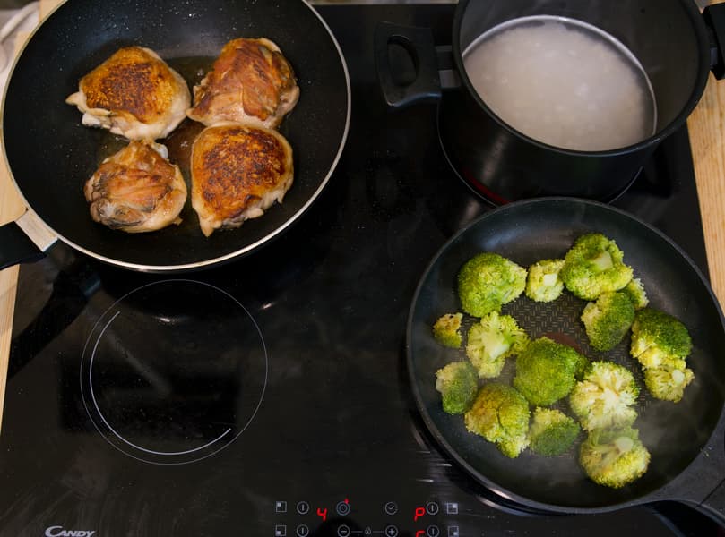 Пока закипал рис и нагревалась сковородка с брокколи, на большой сковородке на максимальной мощности жарилась курица. Нам хотелось проверить способность не самой мощной конфорки к быстрому обжариванию. Вердикт: она на это способна, и скорость обжаривания оказалась даже выше, чем мы ожидали. Когда курица заметно подрумянилась с обеих сторон, снизили нагрев до 4, накрыли крышкой и переключились на остальные продукты.
