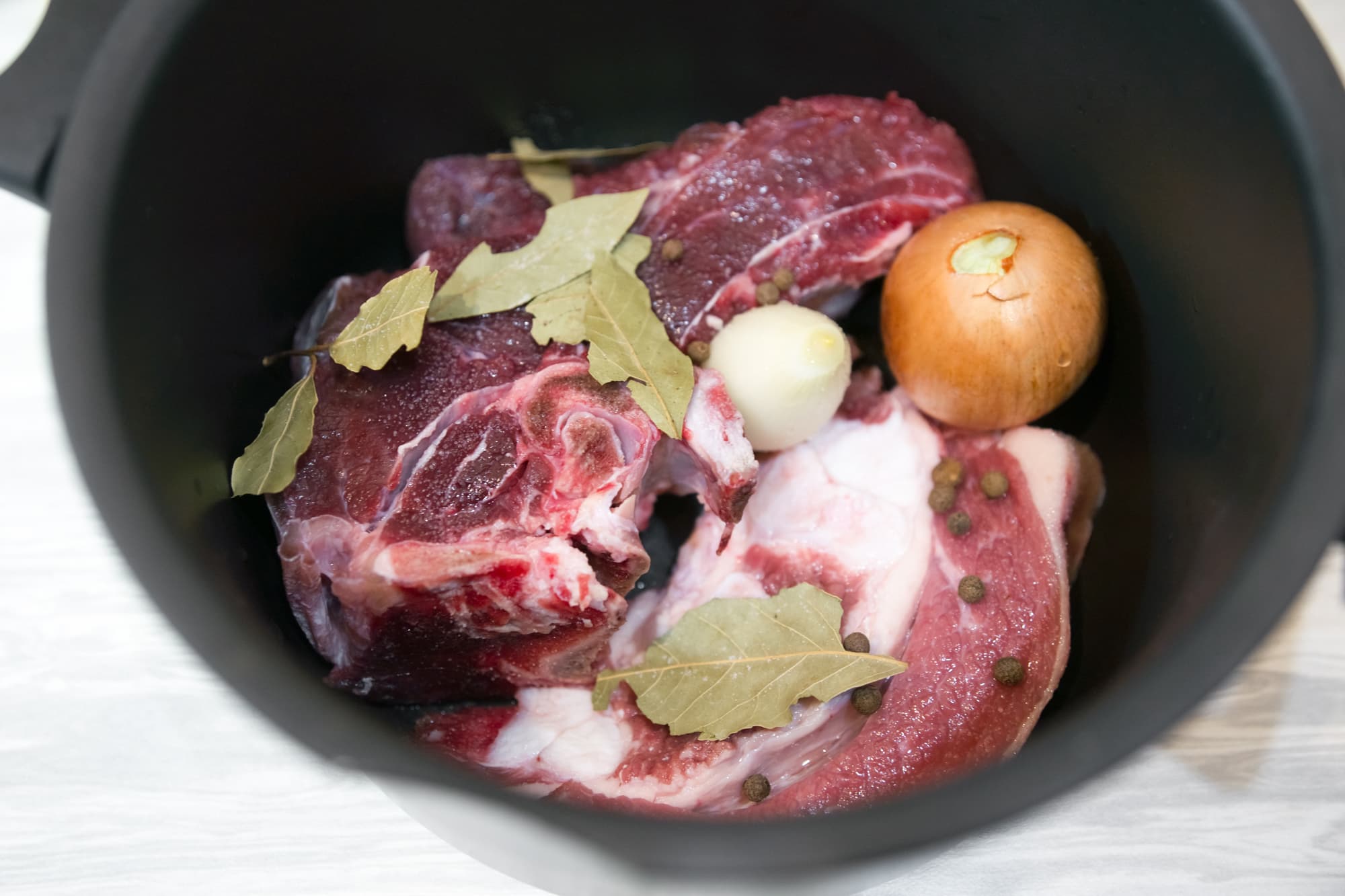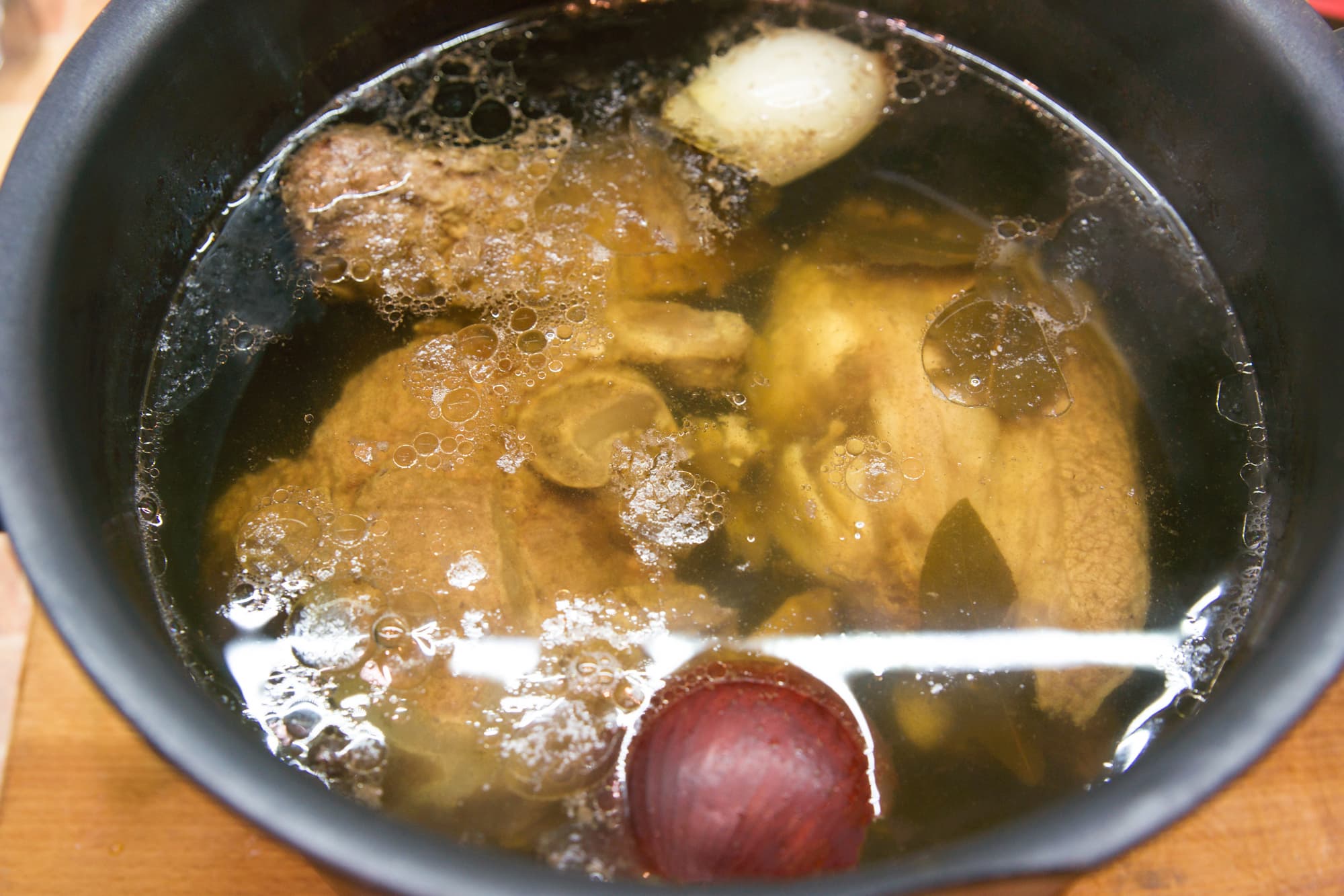 Поместили в кастрюлю пару кусков говядины на кости, луковицу, лавровые листья, черный перец горошком и щепотку соли, залили водой, накрыли крышкой и поставили на дальнюю левую конфорку закипать. После сняли пенку и снизили мощность до 4. Постепенно активно кипение сошло на нет и стало едва заметным, чего мы собственно и добивались. Бульон неспешно томился при 90—92 °C. Температура жидкости всё время оставалась в этих пределах. Несмотря на отключения конфорки, а на 4-й мощности это происходит каждые полминуты, нагрев был стабильным, без резких перепадов. Через пару часов у нас получился крепкий ароматный бульон.