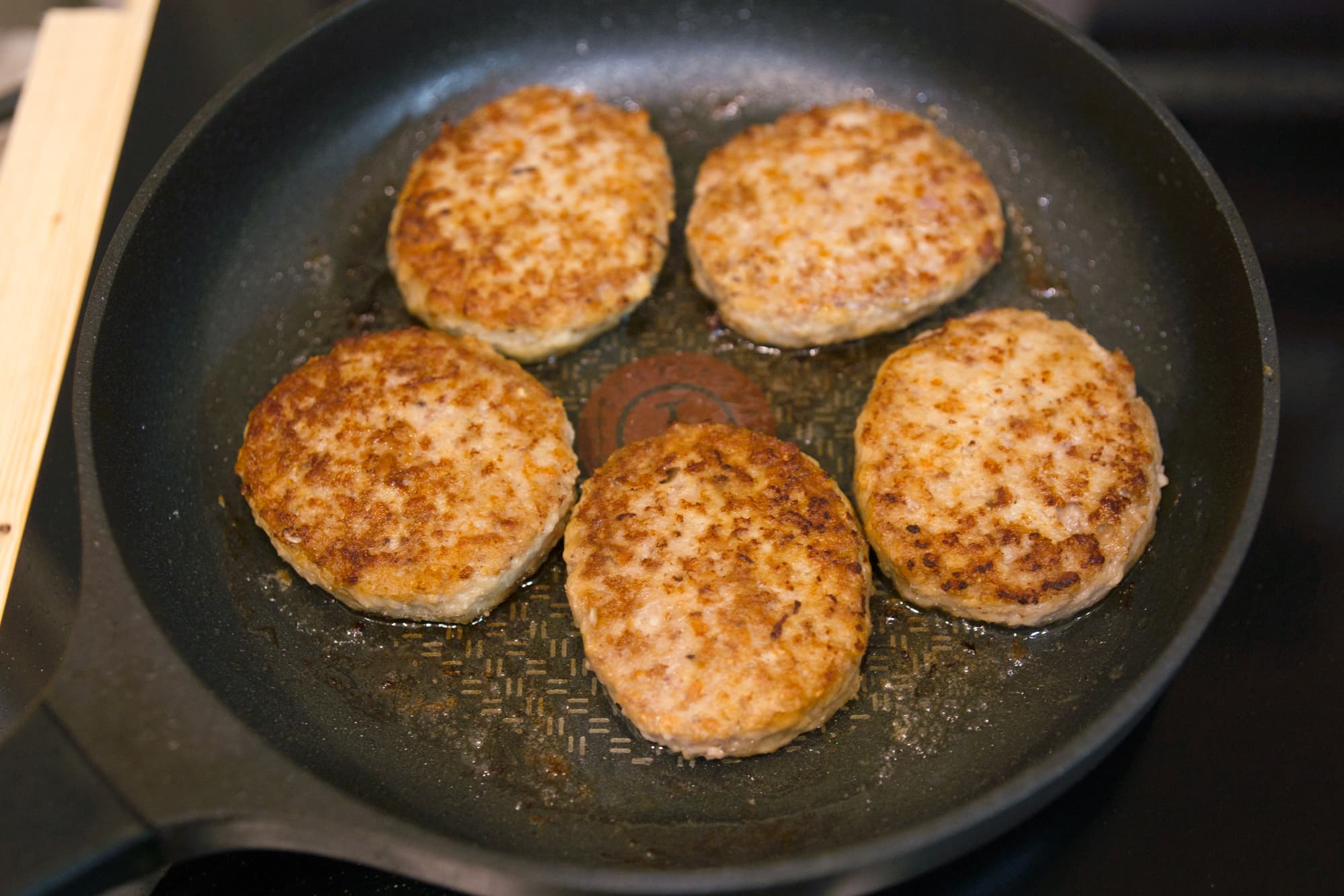 Сначала котлеты подрумянивались на 9-м режиме по несколько минут с каждой стороны, потом мы убавили нагрев, накрыли сковородку крышкой и довели их до готовности на 6-м уровне. С учетом нагрева на одну сковородку ушло минут 20, не больше.