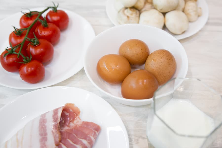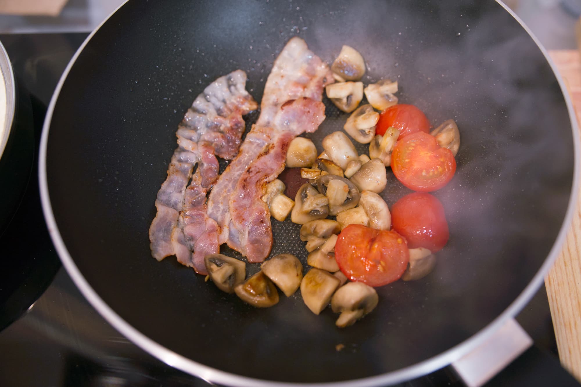 Параллельно на соседней, более мощной конфорке на 9-м уровне нагрева быстро обжарились бекон, шампиньоны и помидоры.