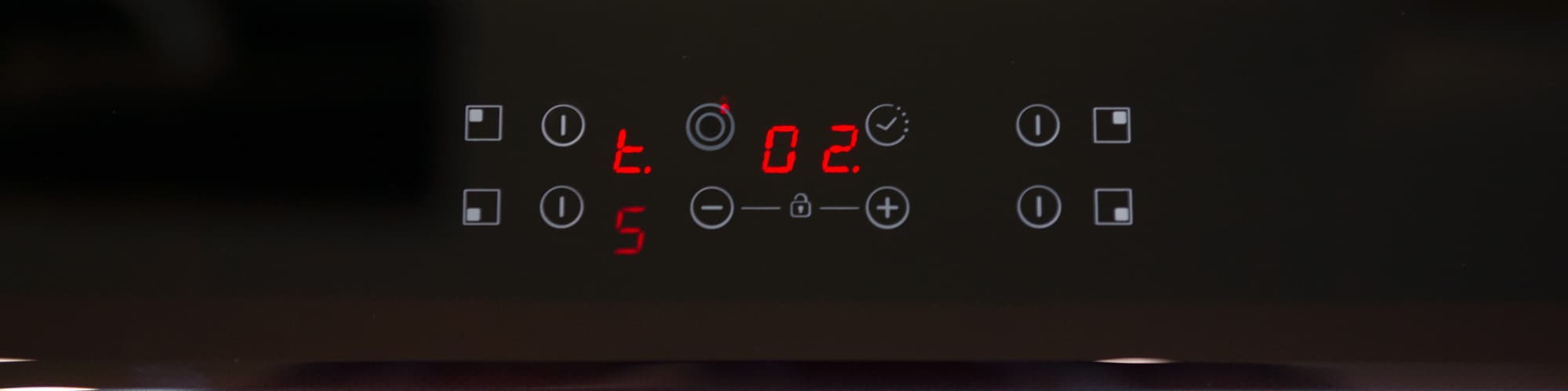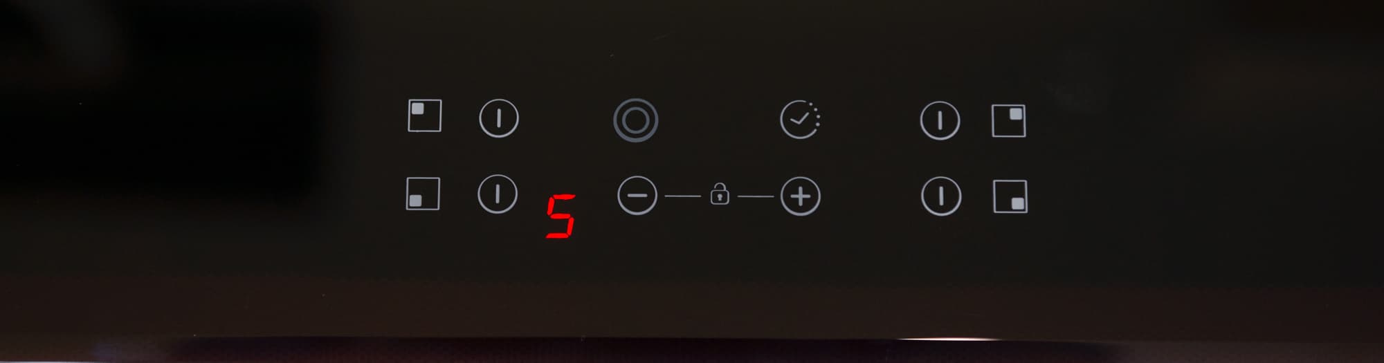 По бокам находятся сенсоры зон нагрева, по центру — четыре кнопки, отвечающие за включение двойного контура крайней левой конфорки и за активацию таймера, а также «−» и «+» для настройки уровня нагрева и изменение времени таймера.